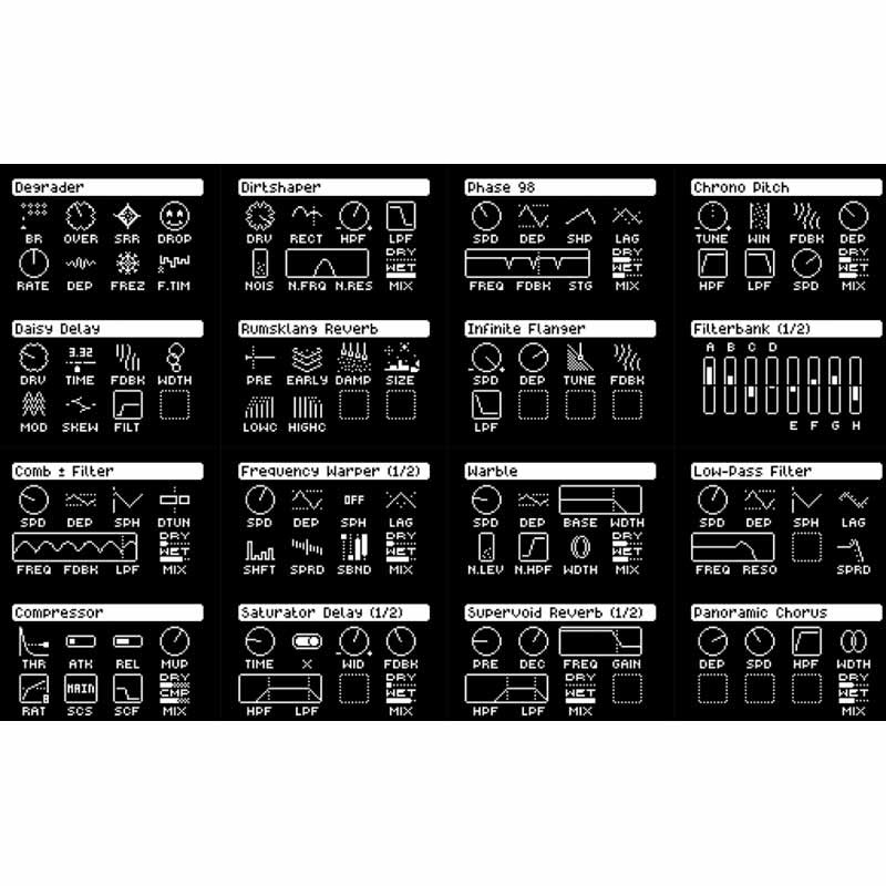 Эффекты: Comb±, Filterbank, Multimode Filter, Infinite Flanger, Chorus, Phaser, Warble, Compressor, Delay (Daisy, Saturator), Reverb (Rumsklang, Supervoid) и другие