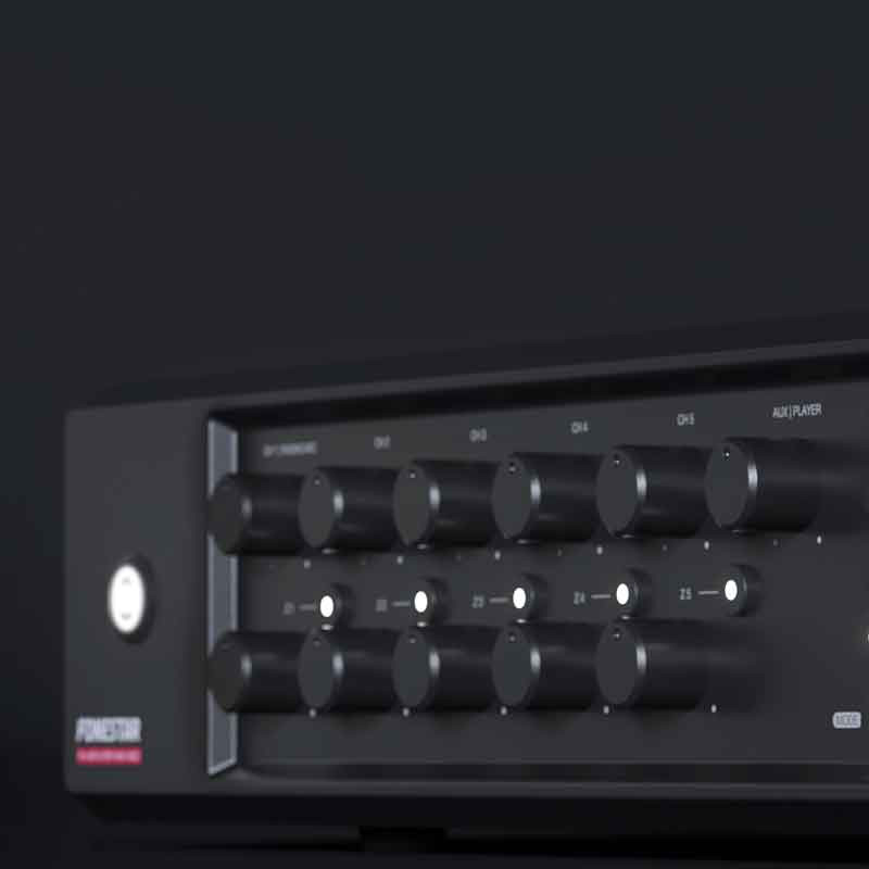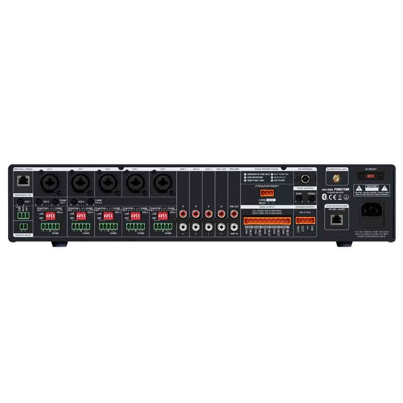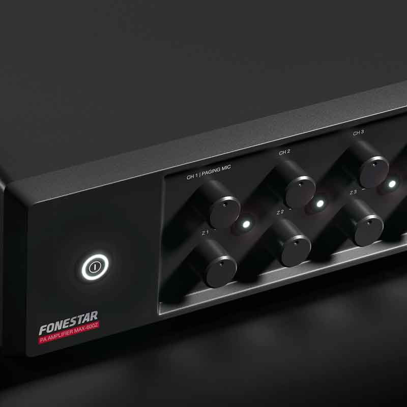 Fonestar MAX-600Z – трансляционный усилитель со встроенным плеером Bluetooth/USB/FM, многозонный, с выходной мощностью 600 Вт RMS, разработанный для сложных инсталляций, требующих индивидуального управления зонами, высокой мощности и максимальной надежности. Он оснащен технологией класса D и импульсным источником питания SMPS, что обеспечивает энергоэффективность и пониженное тепловыделение. Включает полноценный проигрыватель Bluetooth/USB/FM и может управляться через настенную панель дистанционного управления или зонный микрофон ZONEMIC-6.
