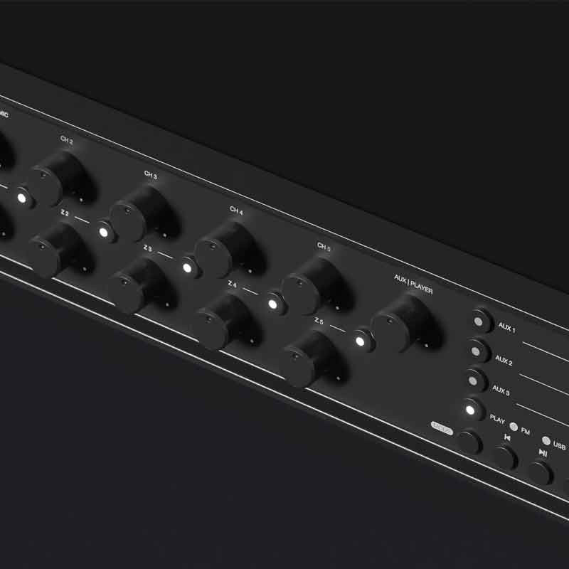 5 независимых зон вывода с селектором громкости и возможностью отключения.