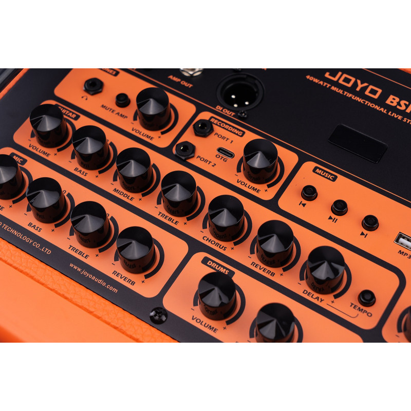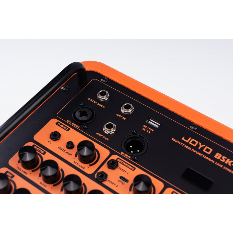 Драм-машина с 20 вариантами ритмичных аккомпанементов, разъемы Amp In и Amp Out, выход XLR для прямого подключения к микшерному пульту или аудиоинтерфейсу, jack 3.5 мм выход для наушников с кнопкой. Комбоусилитель Joyo BSK-40 имеет резьбу 35 мм для крепления на стойку.