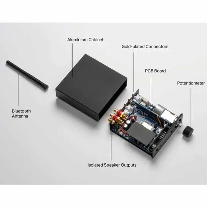 Кроме линейных входов в усилителе есть приемник Bluetooth с поддержкой улучшенных кодеков aptX и aptX HD. С его помощью возможно качественное воспроизведение композиций из совместимых мобильных устройств. Tone Factory Amp S работает в классе D и развивает на выходе мощность до 40 Вт при сопротивлении 4 Ом нагрузки. В схеме применена надежная защита от высокочастотных помех, благодаря чему звучание получается прозрачным и детализированным. Для подключения колонок установлены винтовые клеммы, совместимые со штекерами типа "банан". Также имеется регулируемый выход на разъем mini-jack, по которому сигнал можно подать на внешний усилитель мощности или активные колонки.