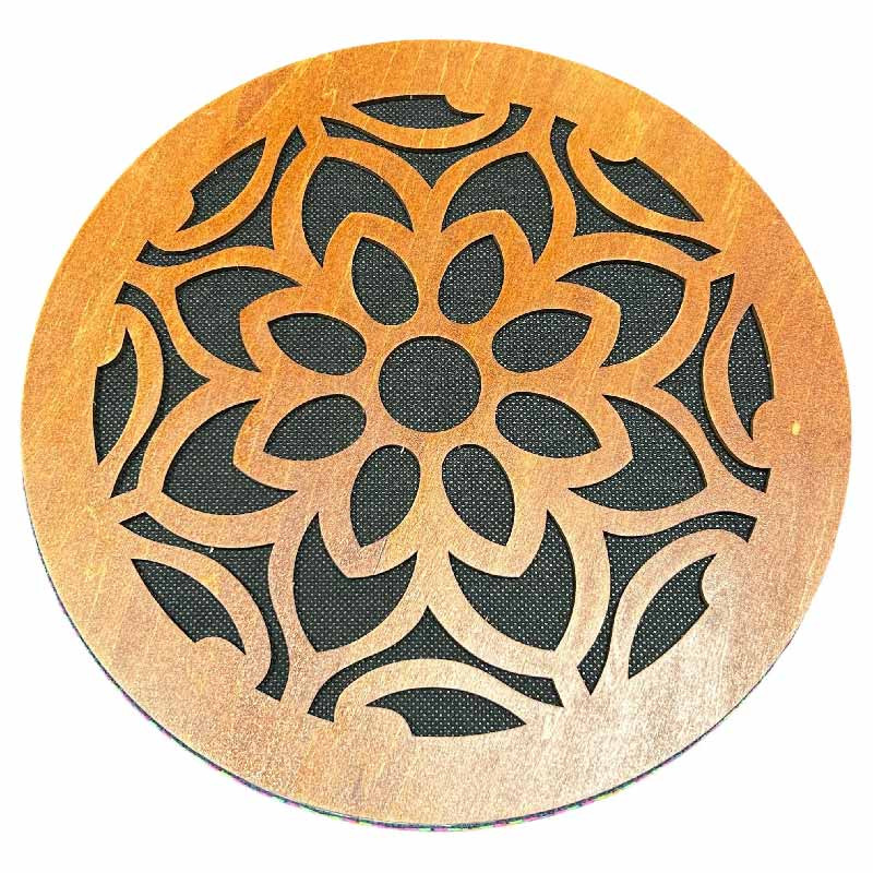 Каркас інструмента виготовлений із натурального дерева, що не лише надає йому міцності та довговічності, але й створює естетичний вигляд із приємною текстурою. Верхня кришка має фігурне лазерне вирізування у формі квіткового орнаменту, що додає вишуканості й дозволяє бачити внутрішнє наповнення. Такий дизайн поєднує практичність та декоративність, перетворюючи інструмент на стильний елемент інтер’єру.