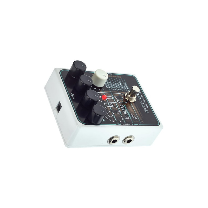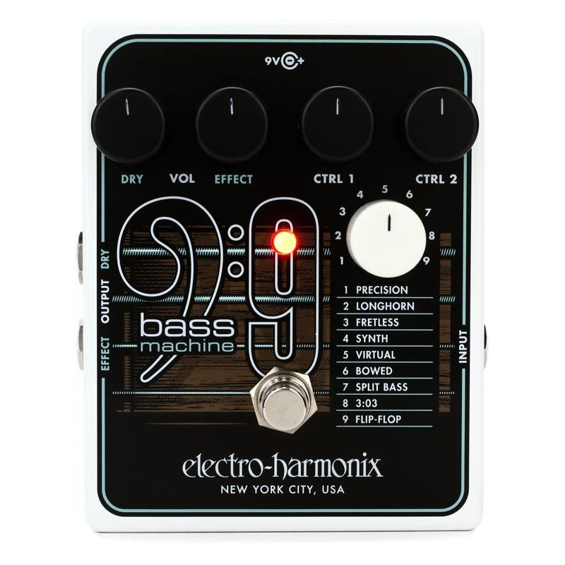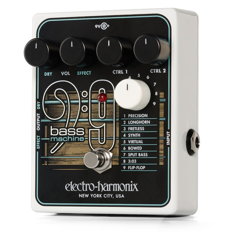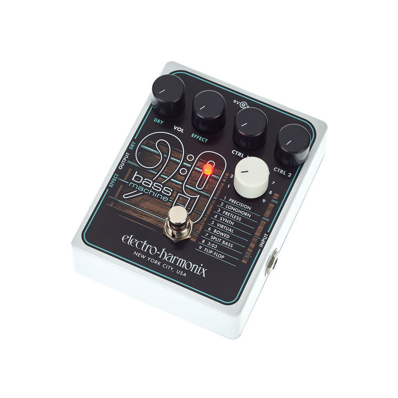 ELECTRO-HARMONIX BASS9 - педаль ефекту, тип ефекту: синтезатор, дизайн: цифровий, моно/стерео: моно-вхід, лінійний вихід з ефектом, елементи управління: чистий сигнал об'єму, гучність, управління 1, управління 2, режими: 9 пресетів, вимикачів: програма, обхідний режим: буферний обхід, потужність: 9 - 9,6 В центральний мінус, споживана потужність: 100 мА, формат корпусу: середній, розміри (S x B x G/see): 7,0 х 5,4 х 11,5.