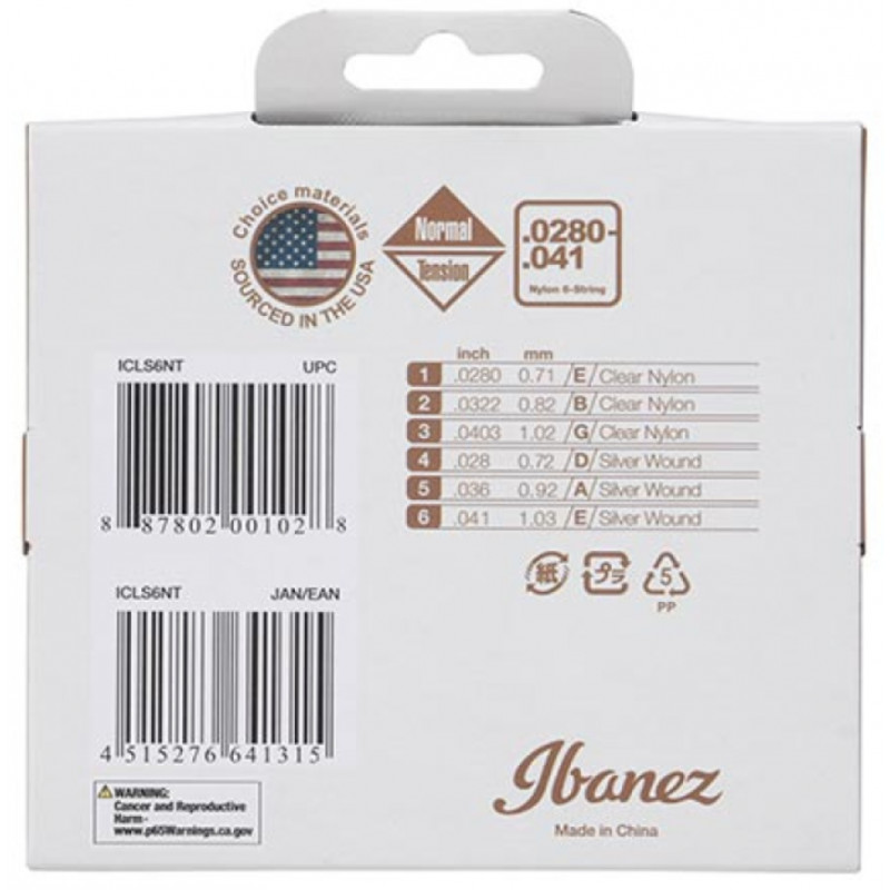 Ibanez ICLS6NT Classic Guitar String 28-41 – набір струн для класичної гітари з нормальним натягом (Normal Tension), що ідеально підходить як для навчання, так і для професійної гри. Верхні струни виготовлені з прозорого нейлону (Clear Nylon), що надає звуку теплий, м'який і виразний характер, а басові струни зі срібною обмоткою (Silver Plated Wound) створюють глибокий і насичений тон.