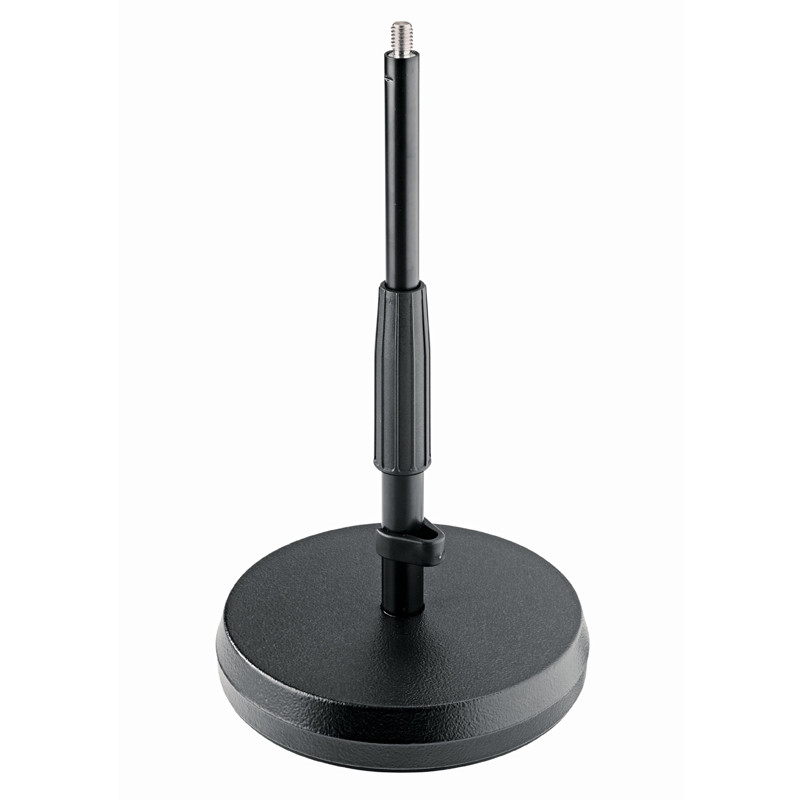 König & Meyer (K&M) 23325 Table/Floor Microphone Stand - коротка стійка з невеликою чавунною основою. Добре підходить для мікрофонних підсилювачів, перкусії тощо. Кругове гумове вставне кільце фільтрує звуки кроків ніг і зменшує передачу небажаних звуків. Гладка регульована муфта для легкого регулювання висоти.