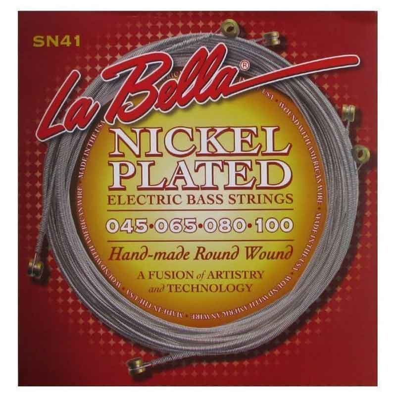 La Bella Nickel Round Wound SN41, 45-100 - комплект струн для 4-струнної бас-гітари 40-100. Струни в нікельованою круглою обмоткою поєднують в собі тепле звучання і відчуття яскравістю нікелю і силою нержавіючої сталі. Струна складається зі сталевої основи, прошарку з нержавіючої сталі і зовнішньої нікельованої обмоткою.