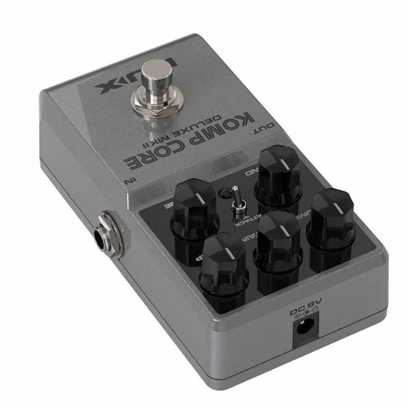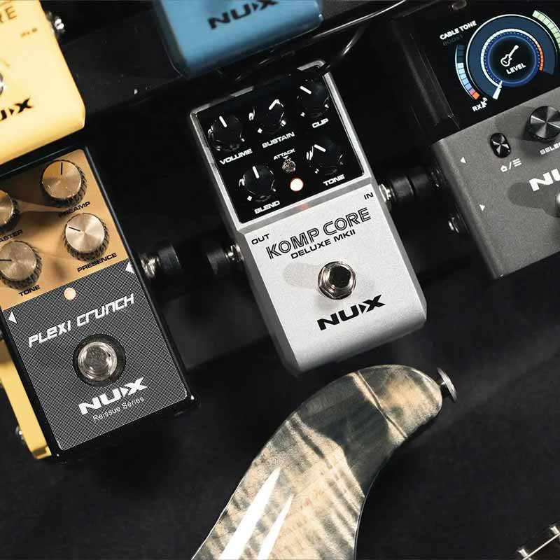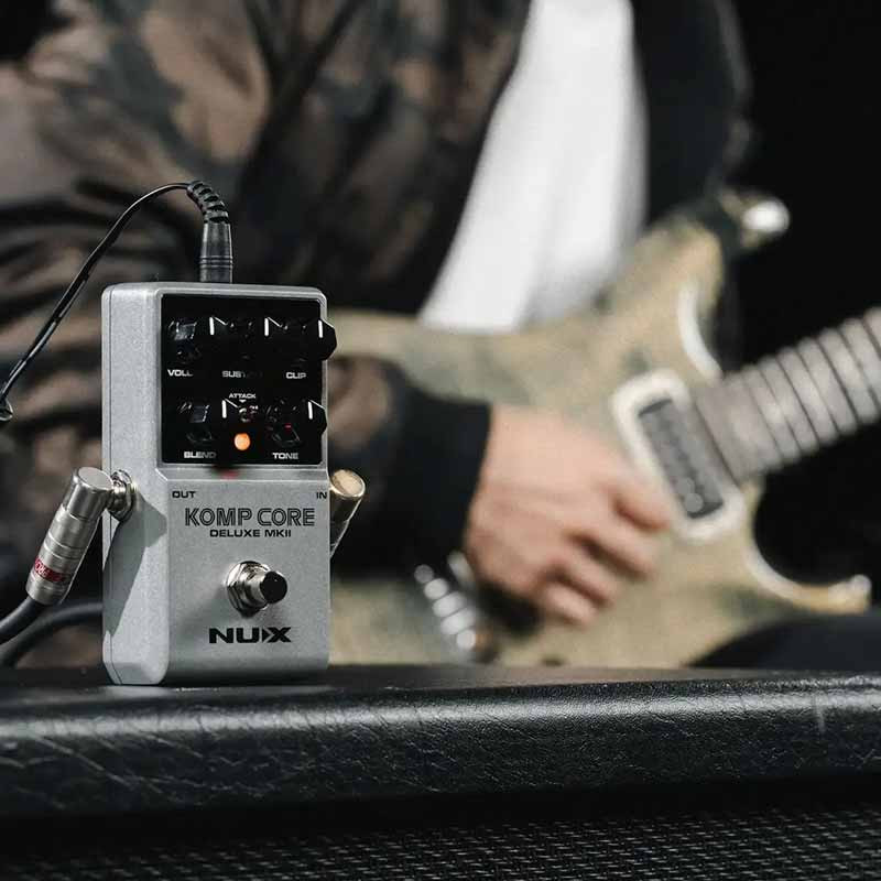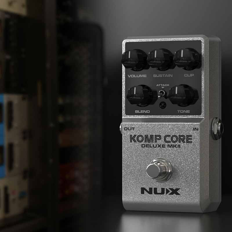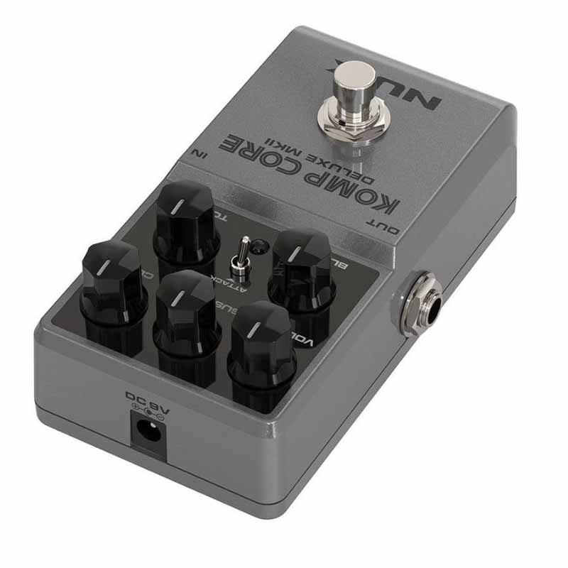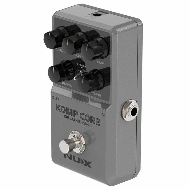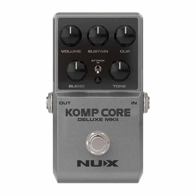 Панель керування з п’ятьма регуляторами (Volume, Sustain, Clip, Blend, Tone) та перемикачем Attack дає змогу відшліфувати звучання до найменших нюансів. Функція sidechain-компресії через регулятор Blend додає гнучкості й текстури, формуючи унікальну динаміку вашого сетапу. NUX Komp Core Deluxe MKII легко інтегрується з іншими педалями та стає невід’ємним інструментом для сцени й студії, даруючи прозорість, чіткість і музичний контроль у кожній композиції.