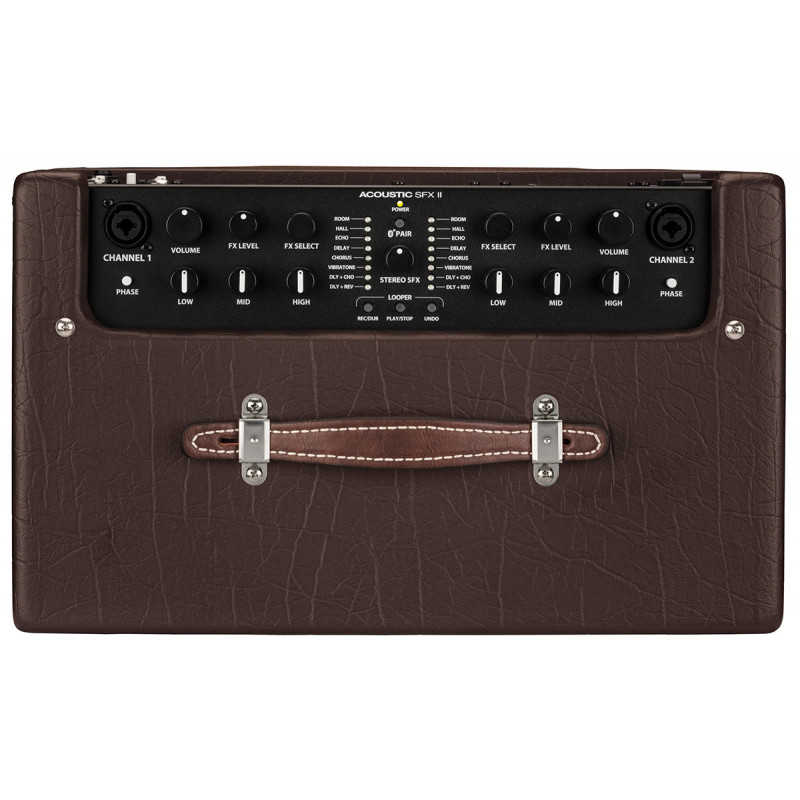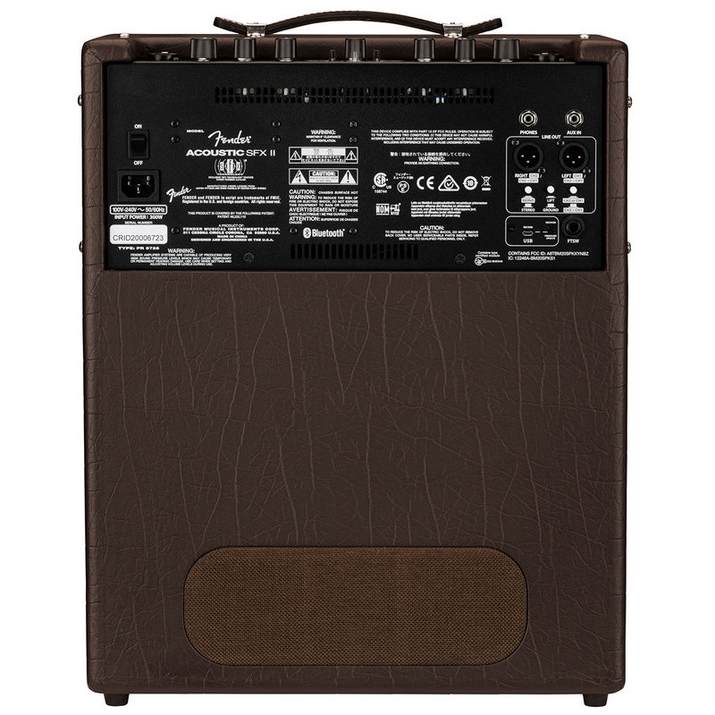 FENDER ACOUSTIC SFX-II - комбінований підсилювач для акустичної гітари, транзистор, потужність: 200 Вт, конфігурація динаміка: 1 х 8", опір: 4 Ом, кількість каналів: 2, еквалайзер: 3-смуговий, управління: об'єм, рівень FX, Fx select, Low, Mid, High - для кожного каналу; функціональні кнопки/перемикачі, входи: 2 х роз'єм (1/4")/XLR; 1 х Джек (1 / 4) - нога 1 х Роз'єм (1/8) - Au, виходи: 2 x XLR; 1 х роз'єм (1/8) - Навушники, колір: коричневий, USB роз'єм; 60-секундний петля; Bluetooth з'єднання з телефонами і планшетами, гарантія: 12 місяців, живлення: мережевий кабель.