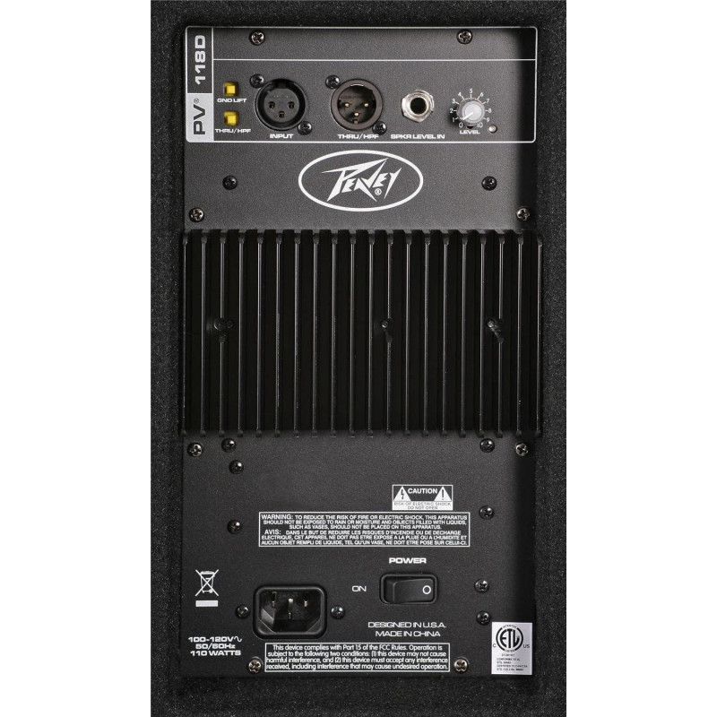 PEAVEY PV118D - активний сабвуфер, діаметр: 18" потужність: 300 Вт (програмне забезпечення), 600 Вт (пік), частотний діапазон: 38 Гц - 120 кГц (-10дБ), 46Гц - 90 кГц (z-3dB), чутливість: 95B, Номінальний імпровент: 8 градусів, максимальний рівень звукового тиску (SPL): 119 дБ, роз'єми: XLR q 1/4" роз'єм, розміри: 686 х 556 х 499 мм, вага: 34,5 кг, виробництво: Китай, гарантія: 12 місяців.