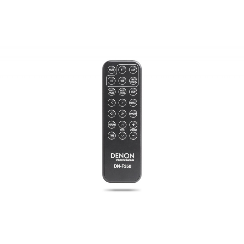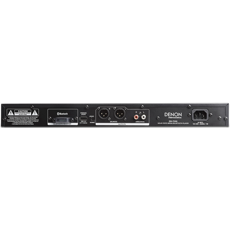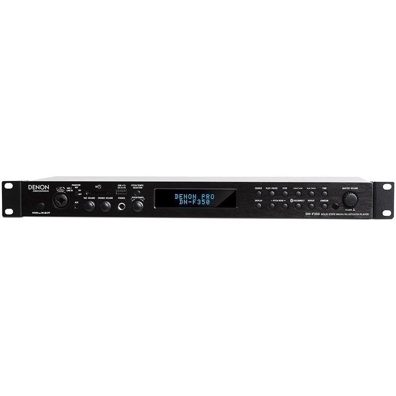 DENON DN-F350 - професійний гравець в 1U-високому рекетира. Діапазон частот 20 Гц становить 20 кГц. Передача аудіо через Bluetooth, діапазон до 50 метрів, підключення до 8 пристроїв. Гніздо для SD-карти. Фантомний мікрофон / лінійний вхід, вхід AUX, вихід навушників, баланс і виходи позабалансом.