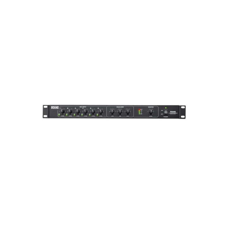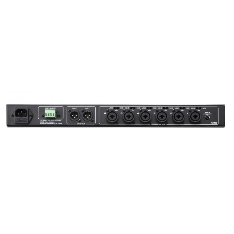 RANE PRO RM6 - 6-канальний змішувач з вбудованим однокамерний D підсилювачем потужністю 120 Вт Він оснащений комбінованими входами XLR/TRS. Можливі варіанти підключення: 4 Ом або лінія 70/100 В.
