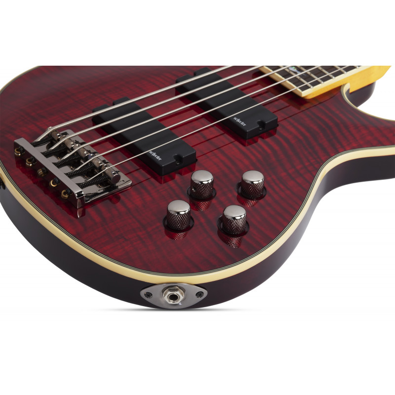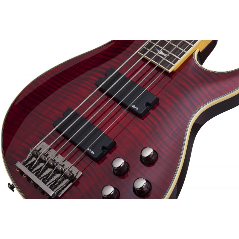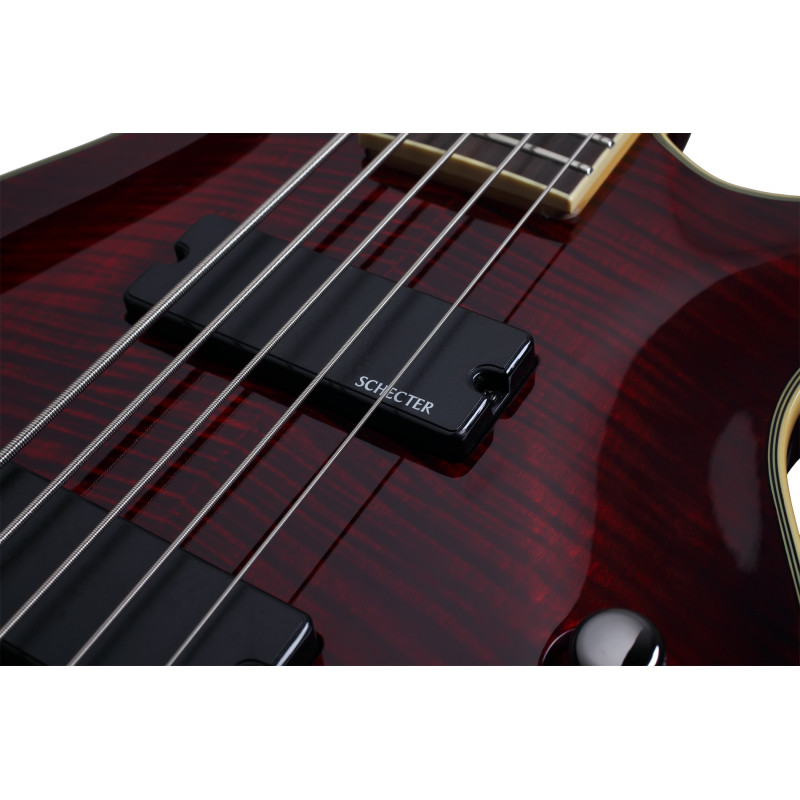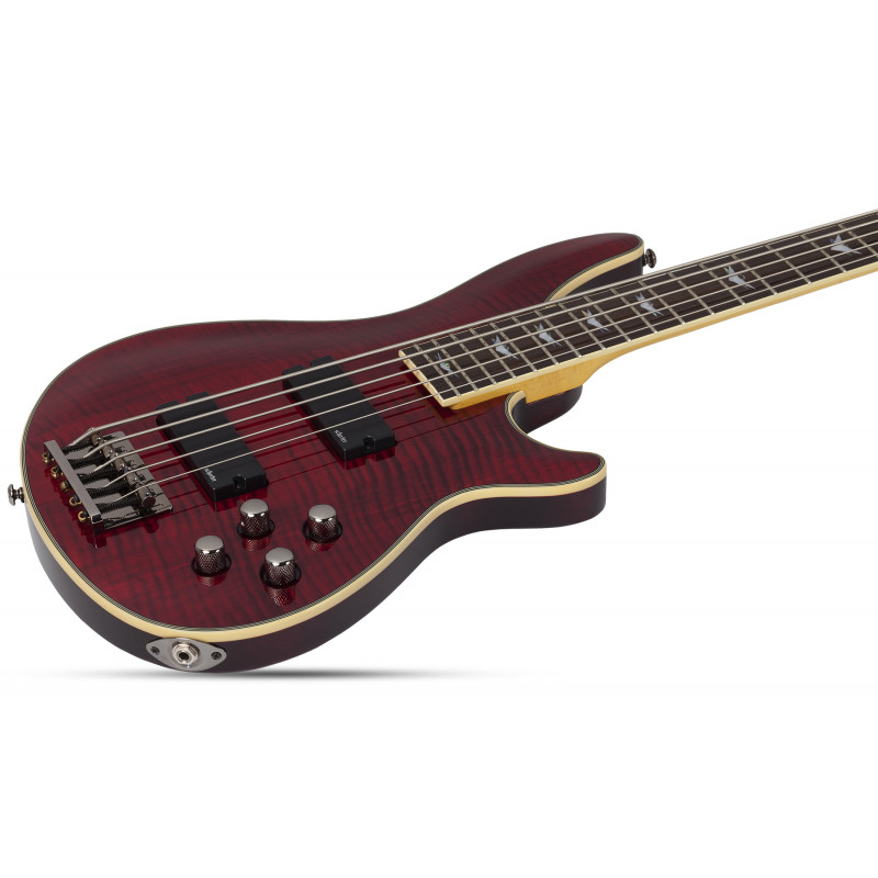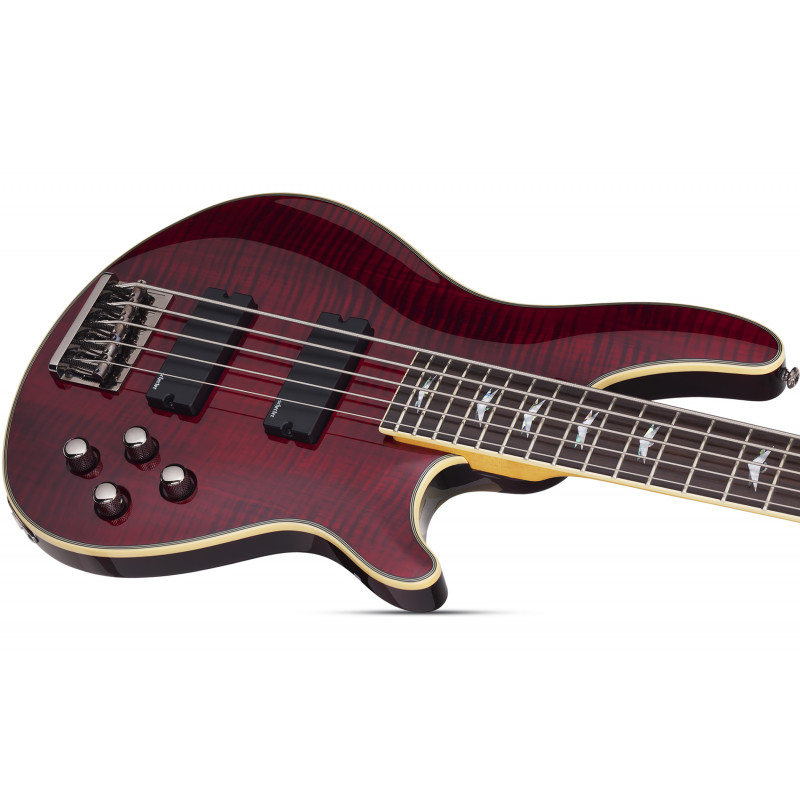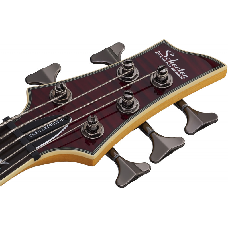 SCHECTER OMEN EXTREME-5 BCH - бас-гітара, стерв'ятникове кріплення: на 6 болтах, матеріал корпусу: червоне дерево, верх: вогненний клен, окантовка корпусу: кремовий багатошаровий, стерв'ятниковий матеріал: клен, підкладка стерв'ятника: палісандер, мітки лади: Абалон, Перлоїдний вектор, мензура: 35" (889 мм), лад: 24 X-Jumbo, радіус грифів: 16" (406 мм), форма гриф: Тонкий 'C' Frets розміри: 1-й лад - .787" (20мм)/ 12-й лад - .866" (22 мм), floggings: Graph Tech XL Black Tus, ширина флогінга: 45 мм, якір: подвійний, регульований, з 4 мм якірним болтом, міст: Diamond Bass, Bridge sound designer: Schecter Diamond Bass, звукодіагент NEC: Schecter Diamond Bass, контролери: майстер-об'єм/майстер змішування/активний 2-смуговий еквалайзер, облягаючий колір: чорний хром, уколи: Schecter, колір: Чорна вишня (BCH) - чорна вишня.