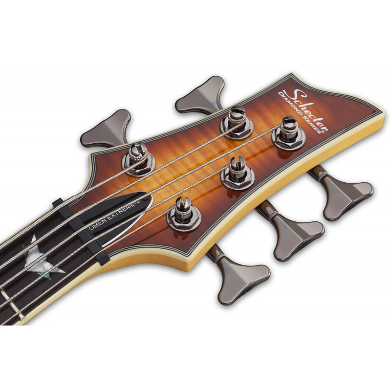 SCHECTER OMEN EXTREME-5 VCB - бас-гітара, стерв'ятникове кріплення: на 6 болтах, матеріал корпусу: червоне дерево, верх: вогненний клен, окантовка корпусу: кремовий багатошаровий, стерв'ятниковий матеріал: клен, стерв'ятникова підкладка: палісандр, фритюрниця: Абалон, Перлоїдний вектор, мензура: 35" (889 мм), фрези: 24 X-Jumbo радіус грифів: 16" (406 мм), форма грифу: Тонкий 'C' Frets розміри: 1-й лад - .787" (20мм)/ 12-й лад - .866" (22 мм), floggings: Graph Tech XL Black Tusq, Ширина: 1 .771" (45 мм), якір: подвійний, регульований, з 4 мм якірним болтом, міст: Diamond Bass, soundmaker міст: Schecter Diamond Bass, звуковий оснащення tek: Schecter Diamond Bass, контролери: майстер об'єму / майстер змішування / активний 2-смуговий еквалайзер, кольорова фурнітура: чорний хром, schecter