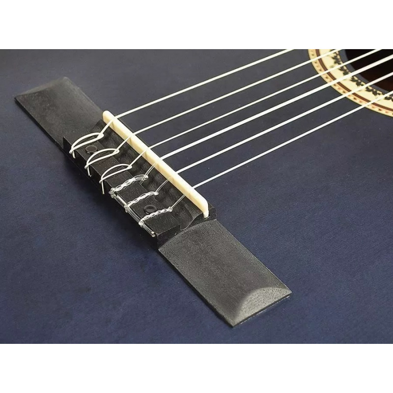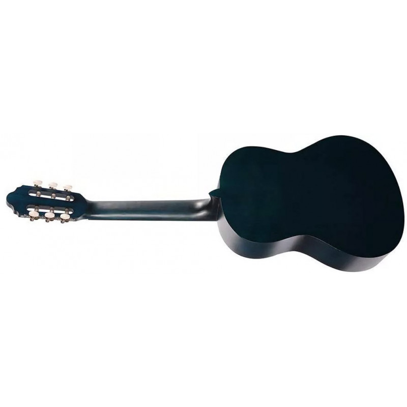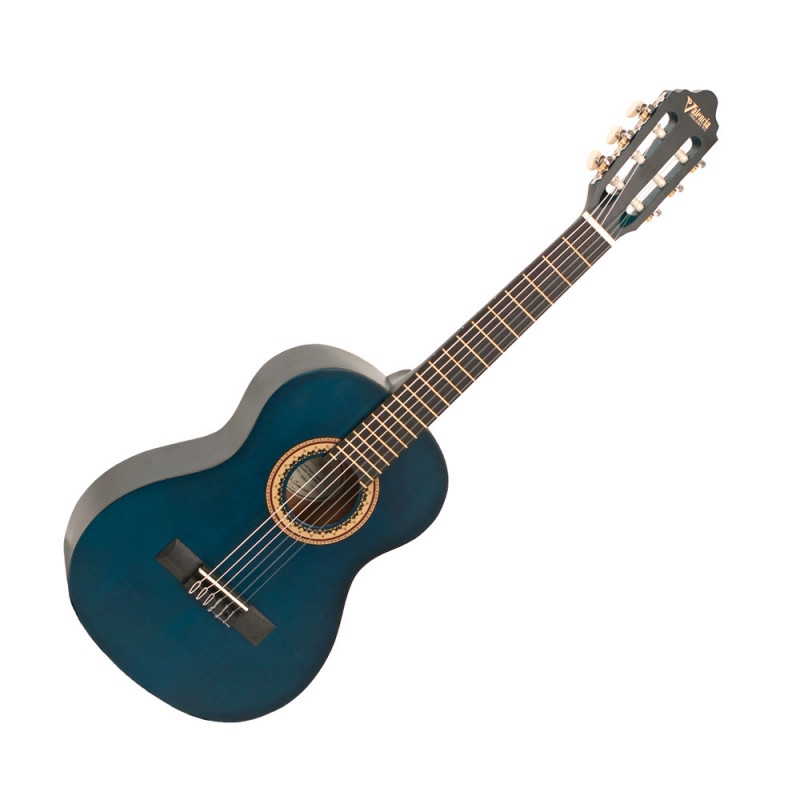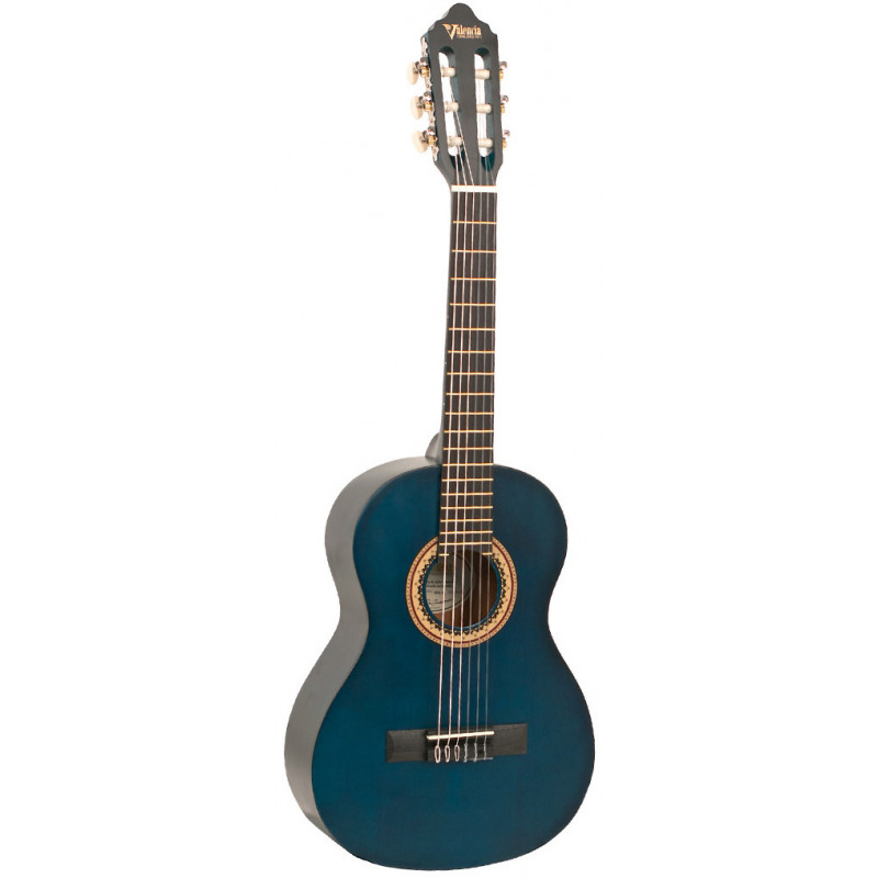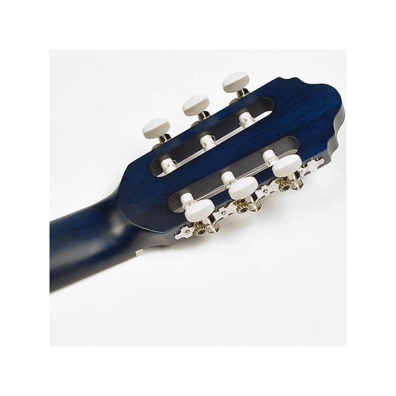 VALENCIA VC203TBU - класична гітара, розмір: 3/4, мензура: 580 мм (22 7/8), ширина верхньої плавки: 48 мм (1 7/8), колір: Прозорий Синій, Верхній матеріал dea: ялинова шия, задня палуба і носок: еппл: ABS - Чорний, стерв'ятник: Jabon, шия окантовка: abs - чорний, підкладка для шиї і міст: Ебонізований клен, бридж-плавка: пластик; Фрей: 19 штук, латунь, уколи: нікель з кремовими капелюхами, покриття: матовий атлас.