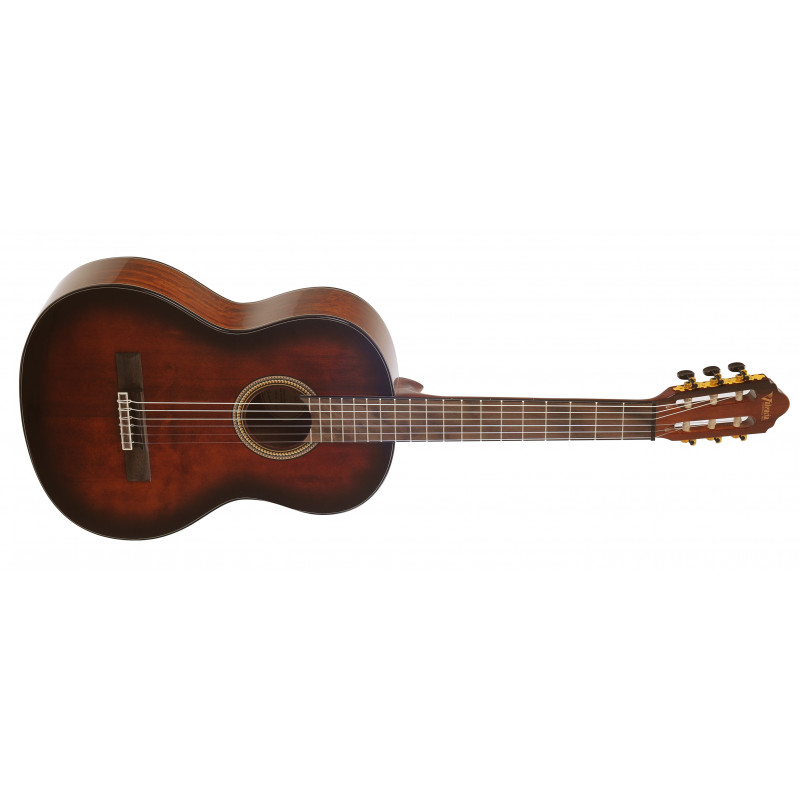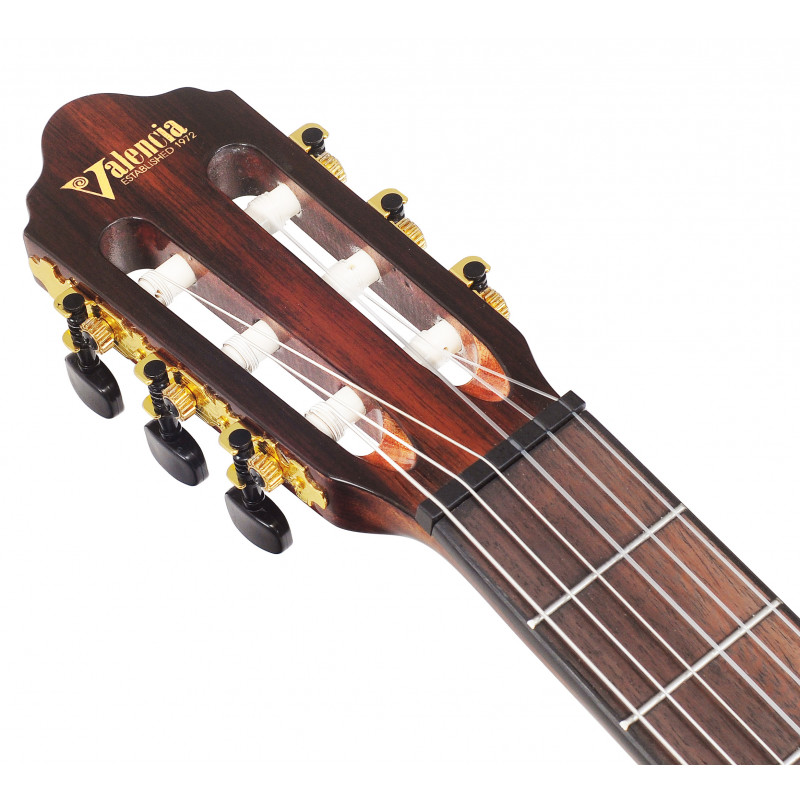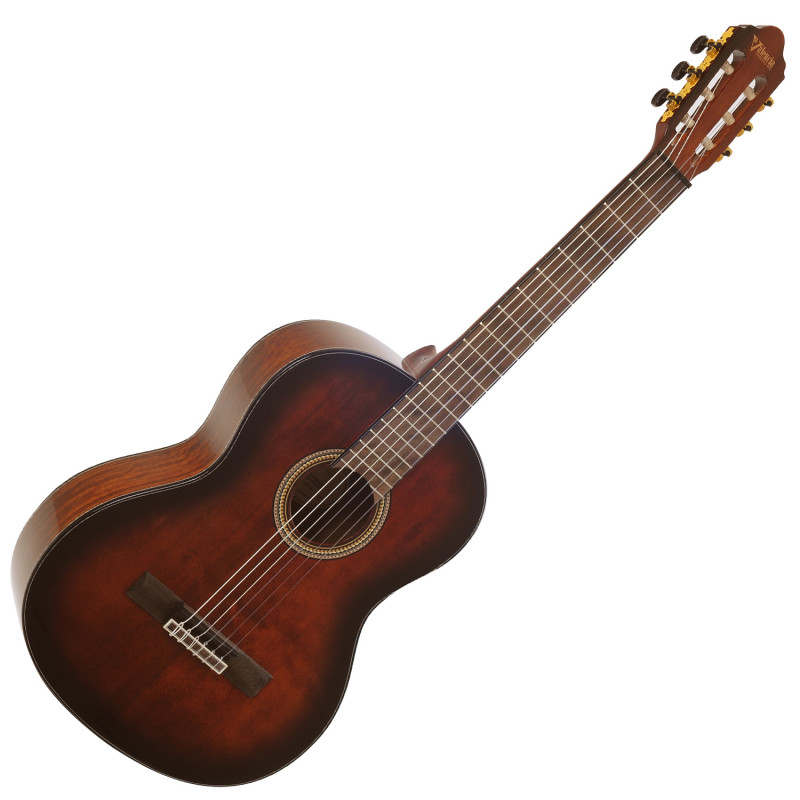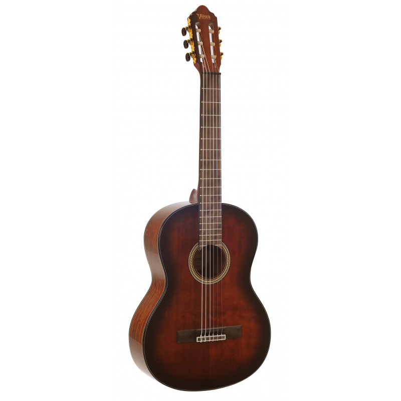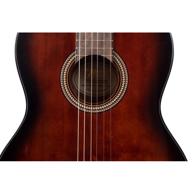 ВАЛЕНСІЯ VC564 BSB — класична гітара, Розмір: 4/4, Мензура: 650 мм (25 5/8"), верхня ширина: 52 мм (2 1/16"), верхній матеріал палуби: ялина Sitka, задня палуба і рило: горіх (опукла задня палуба), верхня оцтова: ABS - 5 шарів Чорно-біла, оксамитова задня палуба: ABS /White, центр. задня панель: ABS - 5 шарів Чорний / Білий, Облицювання голови грифом: чорне дерево Амара, гриф: червоне дерево, підкладка для шиї: Amara black tree, шия оксамит: ABS - Чорний, fret marks: точки - верхній (на краю) гриф, задня частина п'ята гриф: Amara чорне дерево, лад: 19 штук, нікель, міст: Amara чорний дерев'яний, Канада, декор розетки: C'bico, Валенсія, cols: позолочені перловими капелюхами, струни: США, колір: Brown SunBurst, покриття: глянцеве.
