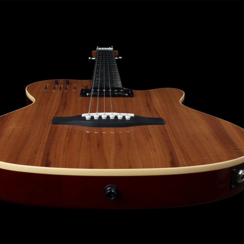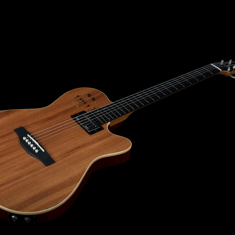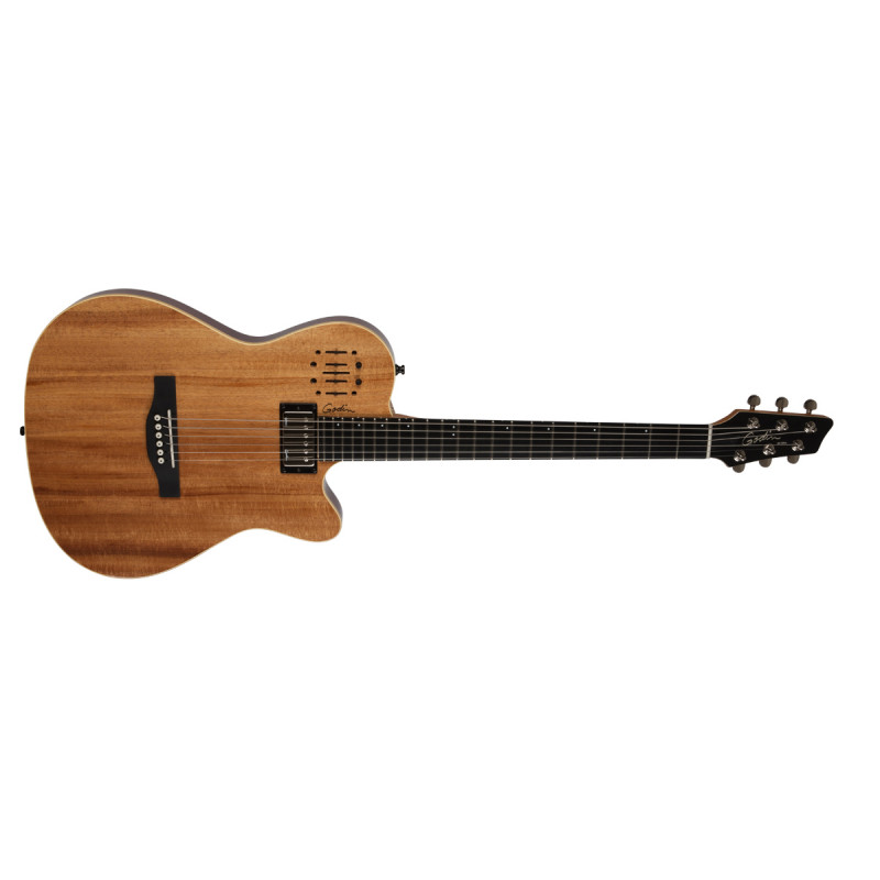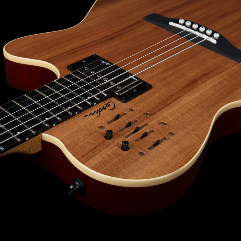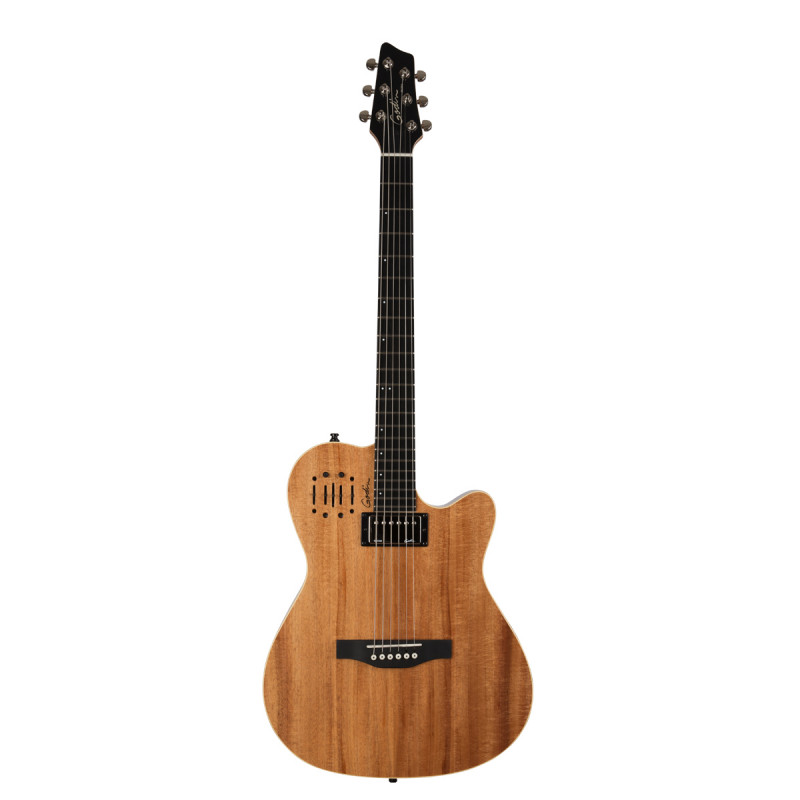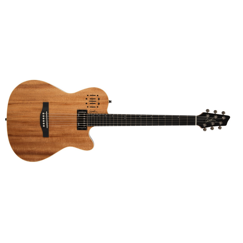 GODIN 037438 - A6 ULTRA KOA HG WITH BAG - акустическая гитара с пъезозвукоснимателем, материал корпуса: сребролистный клён с двумя акустическими полостями + боковины из канадской липы, материал грифа: красное дерево, накладка грифа: Richlite, мензура: 25.50" (647.70 мм), ширина верхнего порожка: 1,69" (42.86 мм), цвет: натуральный, покрытие: глянцевое, кофр/чехол: чехол плотный - Godin Gig Bag, топ корпуса: кoa, радиус накладки грифа: 16" (406.4 мм), материал верхнего порожка: Graphtech, лады: 22, передаточное число колков: 18:1 (басовые) и 26:1 (остальные), звукосниматели: встроенный в бридж акустический звукосниматель и Custom Godin хамбакер в нэке, регуляторы: предусилитель акустического звукоснимателя Godin Custom ползунки - громкость, высокие, средние и низкие частоты, громкость хамбакера, мини кнопки - верхние и низкие частоты хамбакера, выход сигнала хамбакера, выход акустического звуоснимателя, струны: E12 Jazz, толщина струн: .012 .016 .024w .032 .042 .052.