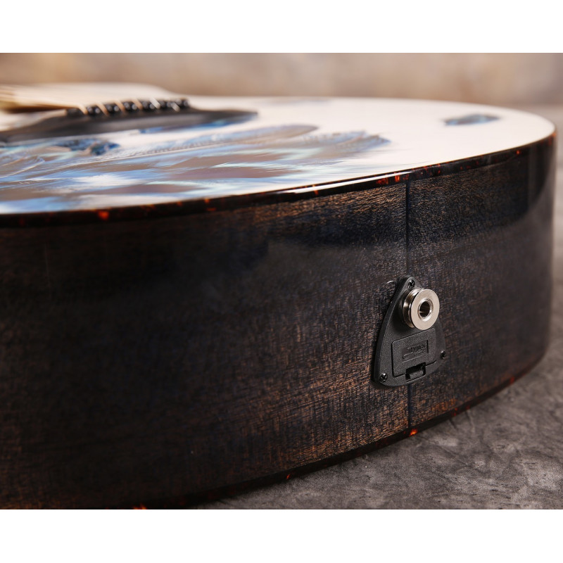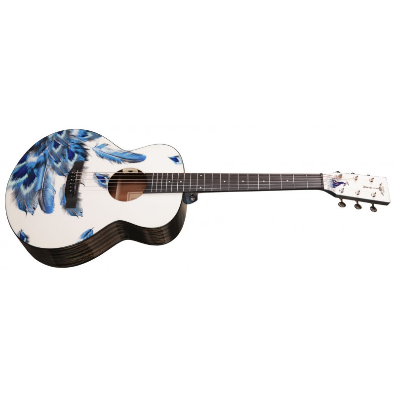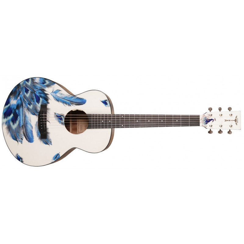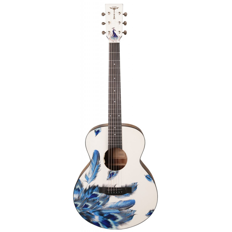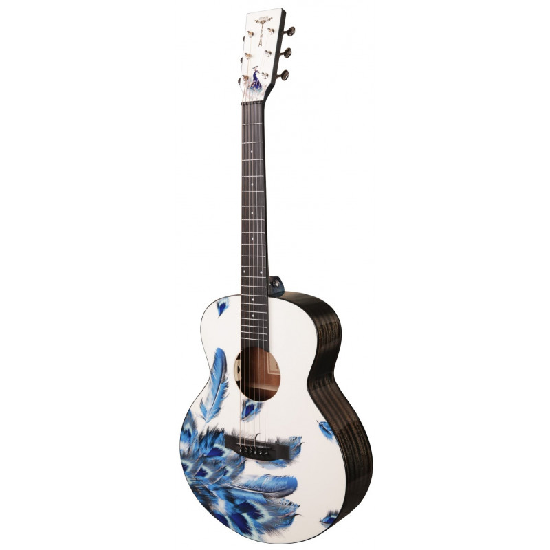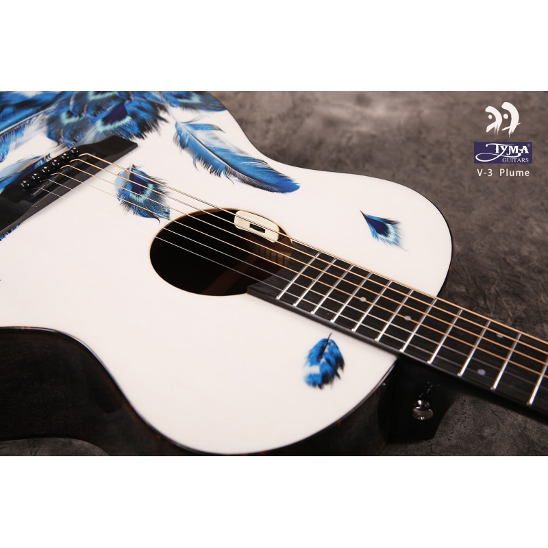 TYMA V-3 PLUME MINI - акустична гітара з piesososo-sonic, кузов - міні-джумбо, верхня палуба: ялина sithinka, задня палуба і обеліск: африканське червоне дерево, гриф: африканський червоний, міст і підкладка: штучний чорне дерево. Оздоблення - білий принт з синім оперенням. Електроніка: TYMA T-50, menzura 23.4', 20 ладів. У комплекті - фірмовий корпус гітари, тканина для чищення, ремінь.