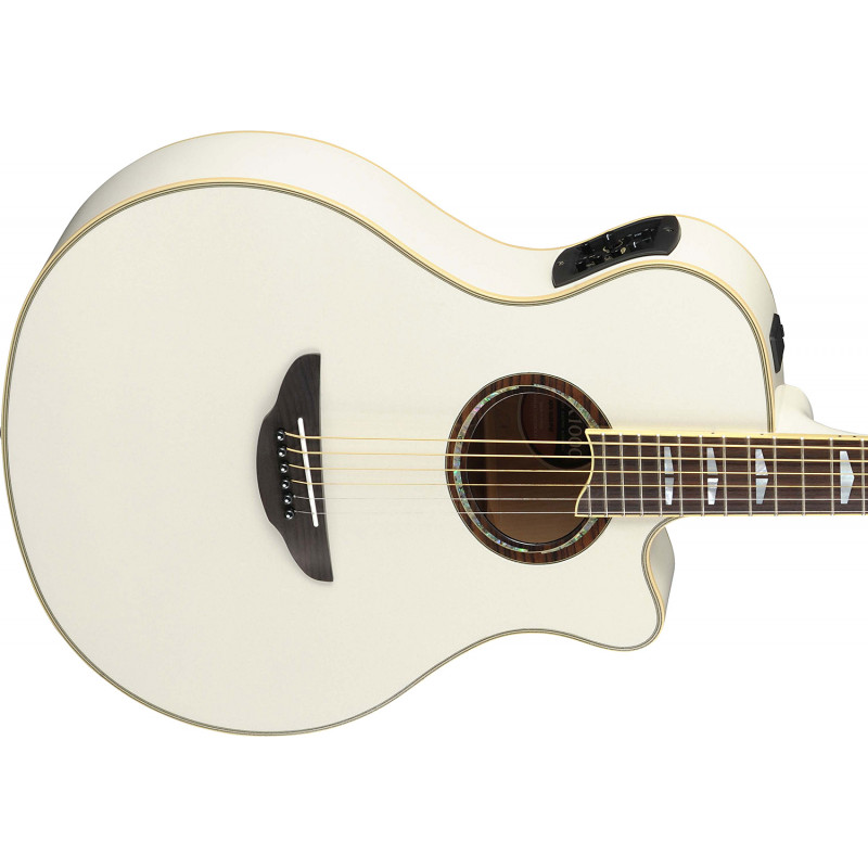 YAMAHA APX1000 (Pearl White) - акустична гітара з п'єзозоцотлею, верхня палуба: тверда ялина(Тверда ялина), нижня палуба: хвилястий клен (Flamed Maple), чохол: хвилястий клен (Flamed Maple), глибина тіла: 80-90 мм, Стерв'ятник: стерв'ятник підкладка: стерв'ятник, місток: пащуха, верхній обтискач: 43 мм, механіка: хром, мензура: 650 мм (25 9/16), звукові детектори: позотат і преп: 63 С.Р.Т, управління: 3-смуговий еквалайзер, тюнер, гучність, вибір моделі мікрофона, автоматичне придушення зворотного зв'язку, резонанс корпусу, фокус/ широкий.