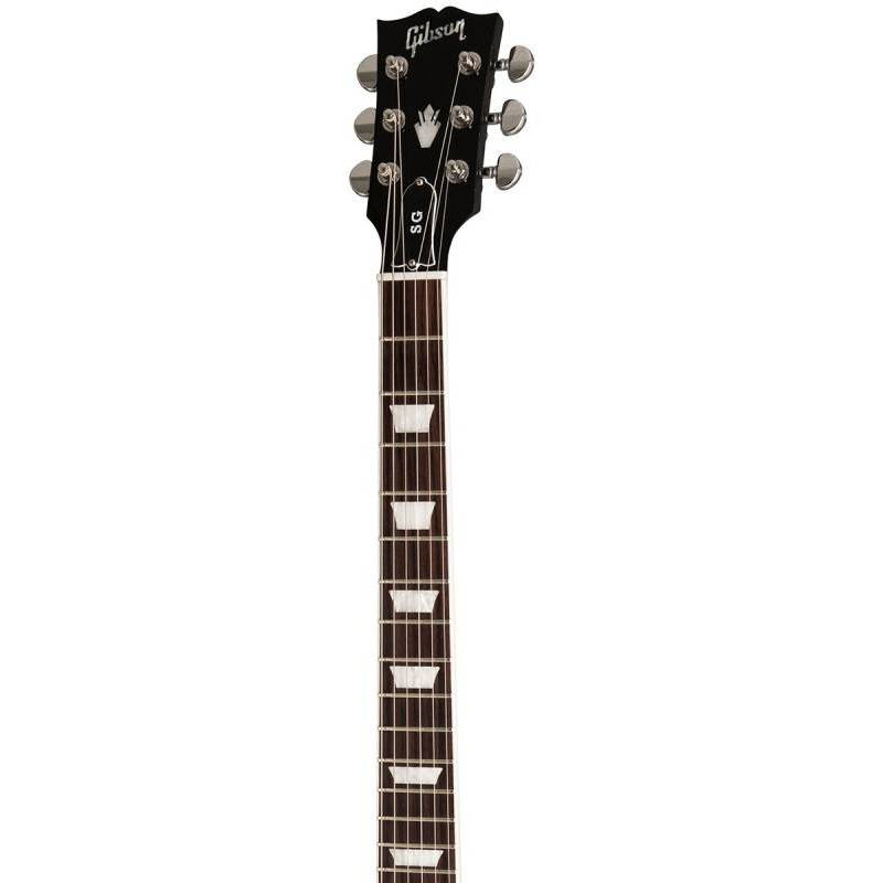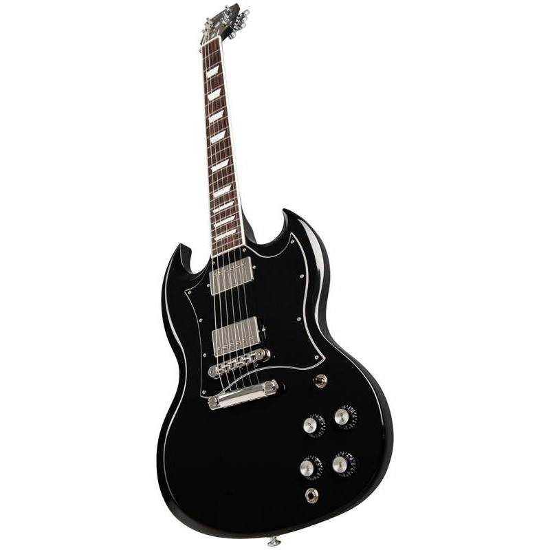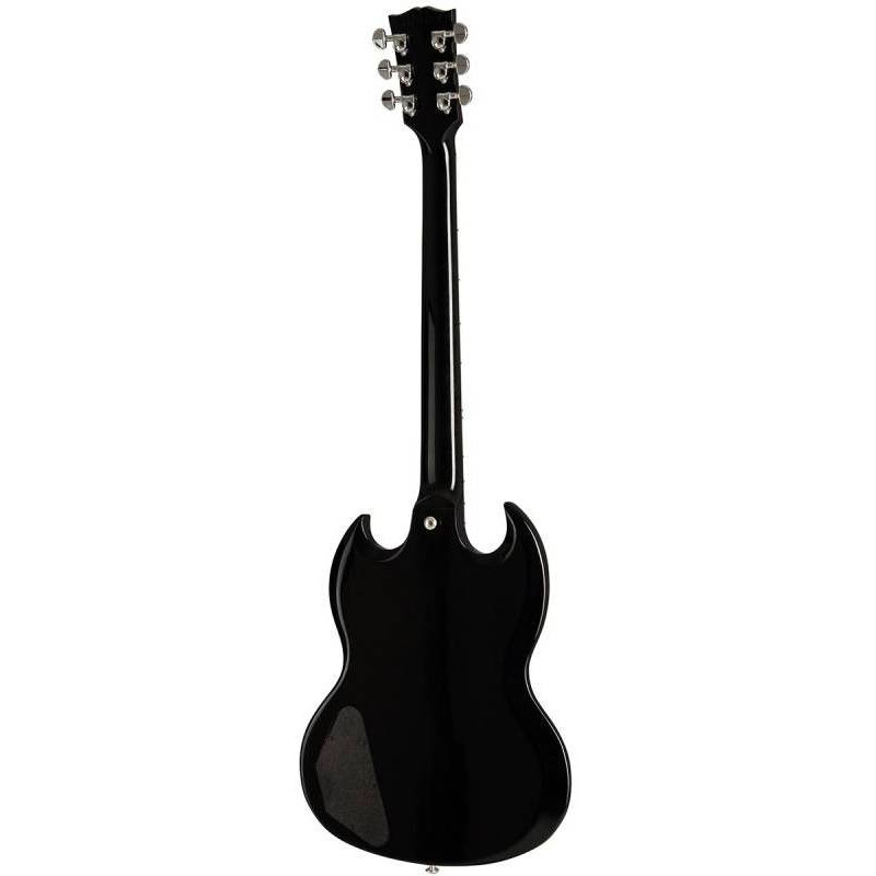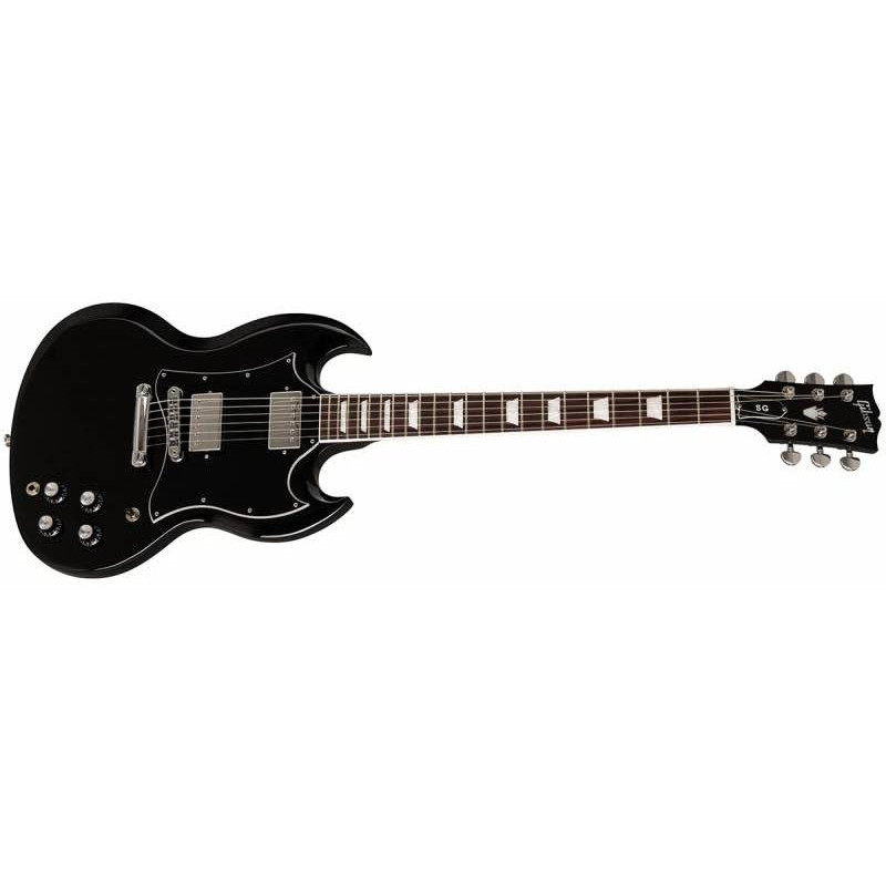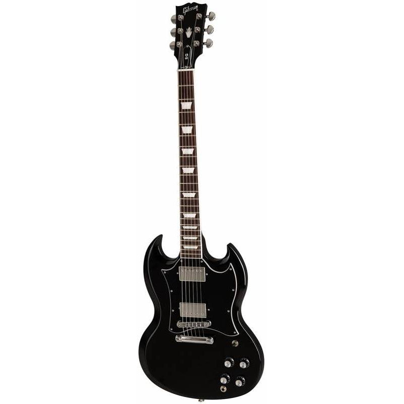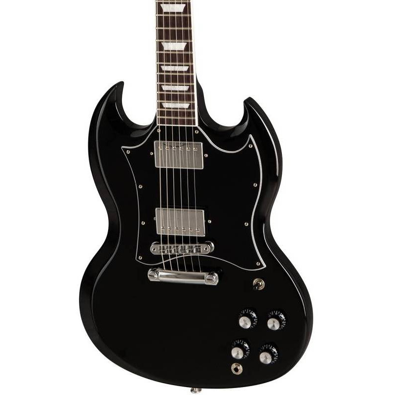 GIBSON SG STANDARD EBONY — електрогітара, увічнена Сантаною в Вудстоку і розбита на сцені Таунсендом. GIBSON SG - це справжня рок-ікона. Виготовлений в Нешвіллі, інструмент оснащений парою звуистих гамбакерів, округлою шиєю і гладкою підкладкою з рожевого дерева. Легка палуба махагоні забезпечує відмінну стійкість. Гітара покрита розкішним глянцевим нітроцелюлозу лаком, який не тільки відмінно виглядає, але і покращує звучання.