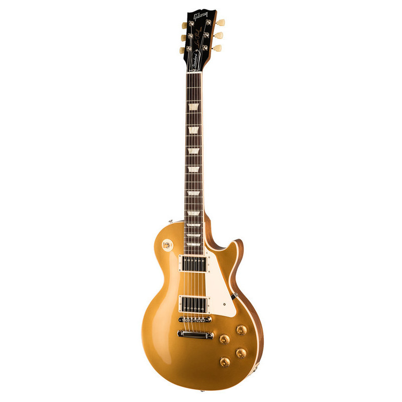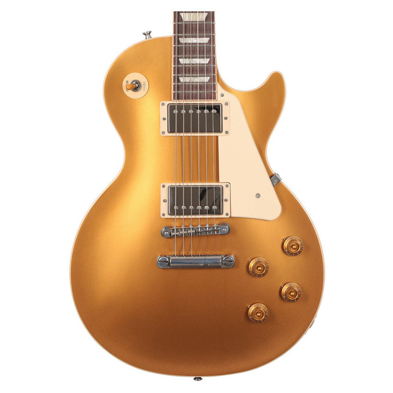 GIBSON LES PAUL STANDARD 50S GOLDTOP — електрогітара, вигляд: правий бік, кількість струн: 6, колір: чорний, кількість ладів: 22, звукозаписувачі: H-H, тремоло: ні, дека матеріал: червоне дерево, гріфф матеріал: червоне дерево / чорне дерево, мензура: 24.75" (629 мм), форма корпусу: Firebird Тип стерв'ятника вкладення: паста, стерв'ятниковий профіль: Середній С, регулює: 2 об'єму, 2 тони, 3-позиційний перемикач, міст: Tune-o-matic, барбуси: гров нирки, інвази: на гриф у вигляді перламутрових блоків, гарантія: 12 місяців (на механічні компоненти), оздоблення: гітара, корпус.