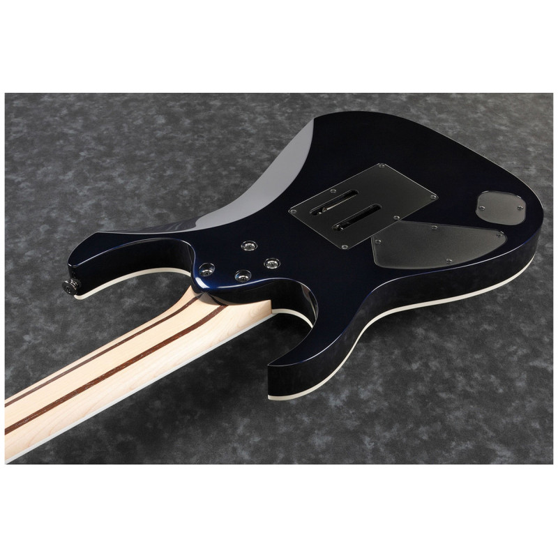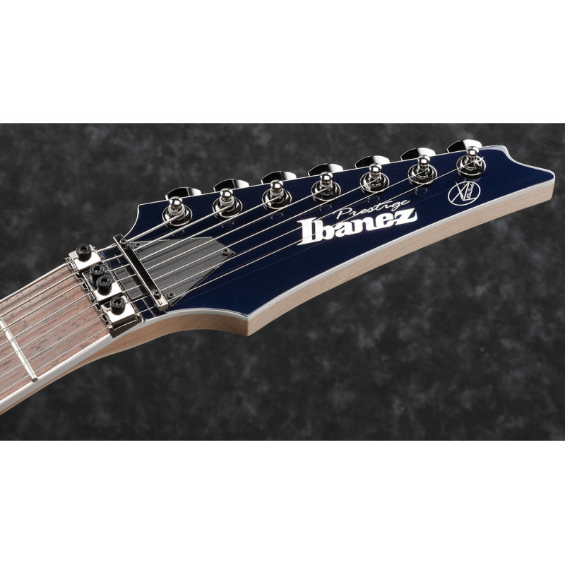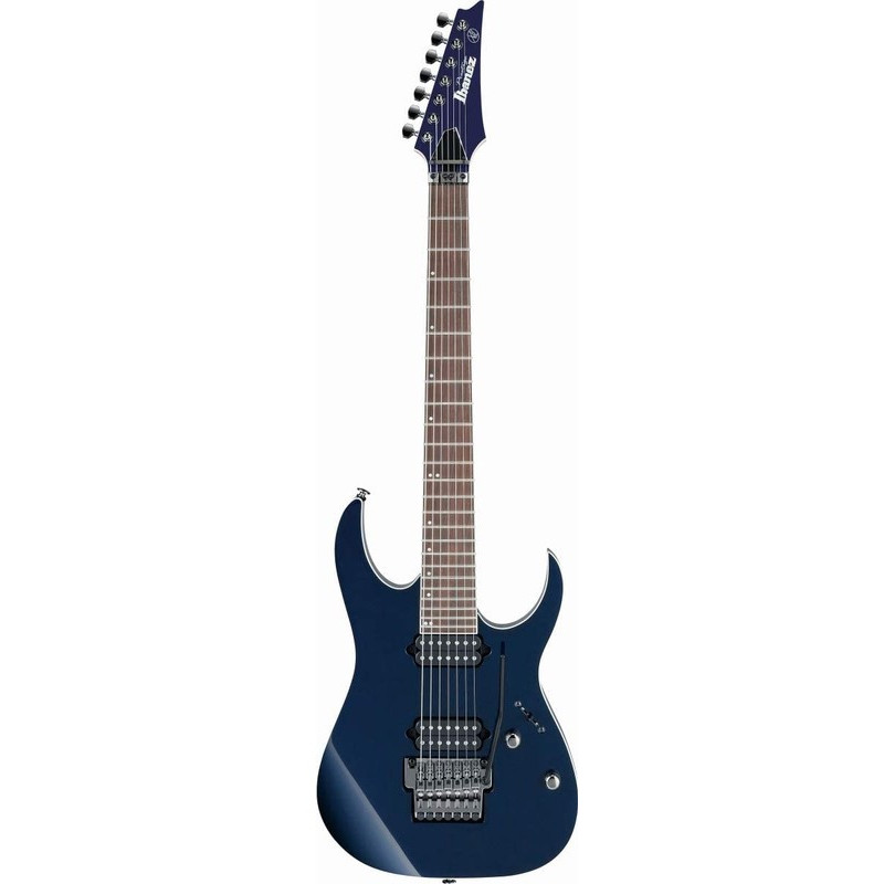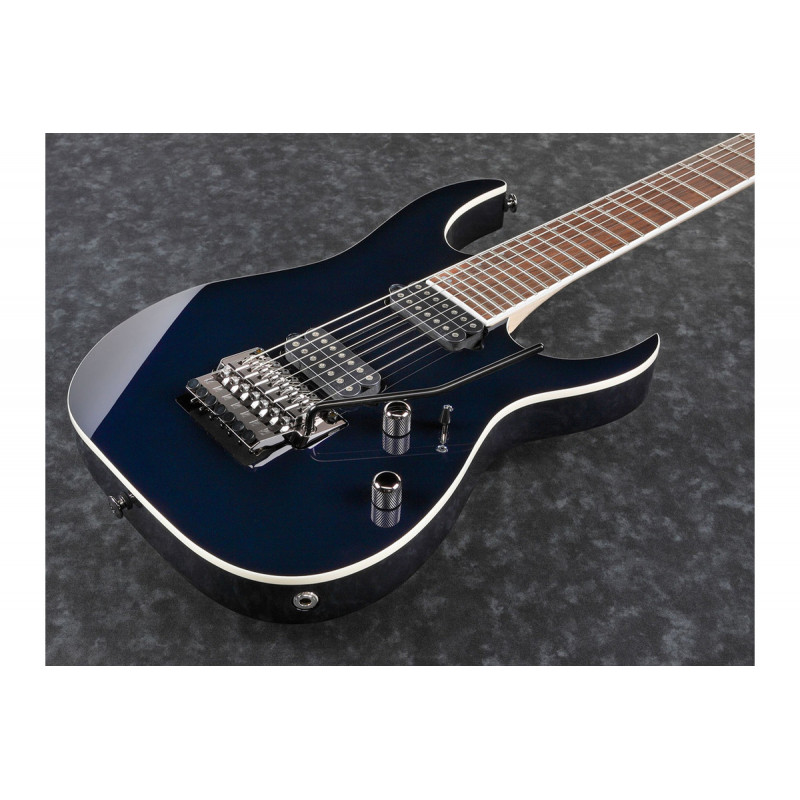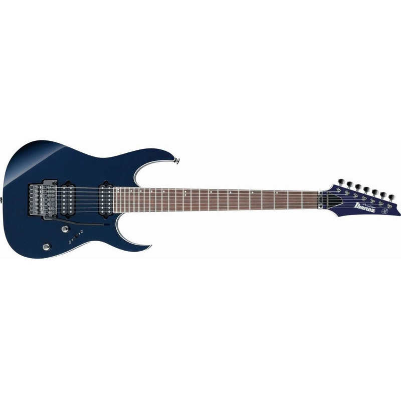 IBANE RG2027L DTB - електрогітара, праворуч, серія: Престиж, кількість струн: 7, колір: синій, кількість ладів: 24, звукові колектори: Н-Н, тремоло: є, матеріал дека: липа, стерв'ятник матеріал: клен/венг/чорне дерево, мензура: 27" (686 мм), форма тіла: RG, тип кріплення стерв'ятника: Стерв'ятниковий профіль: Майстер-7, регулятори: 1 об'єм, 1 тон, 5-позиційний перемикач, міст: Тремоло міст Lo-Pro Edge 7, барбуси: чорний, інкрустатори: на гриф у вигляді перламутрових точок, струни: D'Addario EXL120-7, гарантія: 12 місяців (на механічні компоненти), оздоблення:
