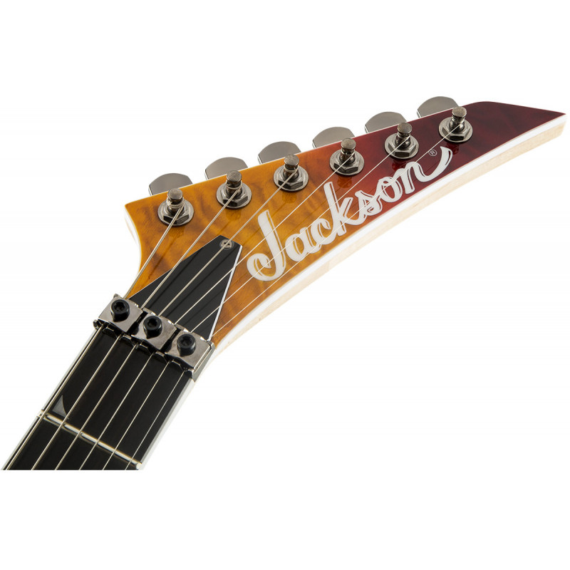 Пофарбований в помаранчевий градієнт, JACKSON PRO SOLOIST SL20' MAH EN DESERT SUNSET SKY прикрашений традиційною 6-в-рядовою головою Джексона в тон, білою оксамитовою колодою, чорною нікелевою фурнітурою, зубами піраньї в пустелі і баром Dunlop.