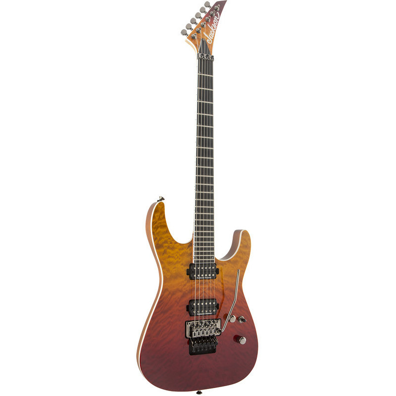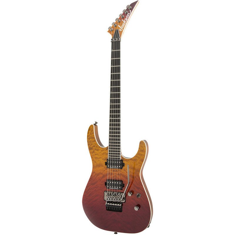 JACKSON PRO SOLOIST SL20' MAH EN DESERT SUNSET SKY - електрогітара, вид: правий бік, кількість струн: 6, колір: червоно-жовтий, кількість ладів: 24, звукові детектори: Н-Н, тремоло: там, деку матеріал: червоне/кнон, стерв'ятниковий матеріал: клан/чорне дерево, мензура: 25.5" (648 мм), Тип насадки для грифів: прохідний, контролери: 1 об'єм, 1 тон, 3-позиційний перемикач, міст: Floyd Rose 1000 Series Double-Locking Tremolo (Recessed), ставки: Jackson Sealed Die-Cast, інтаї: на гриф у вигляді піранії, гарантія: 12 місяців (на механічні компоненти).
