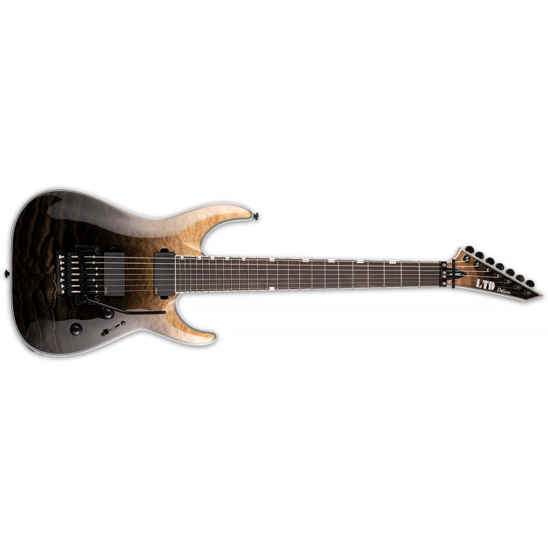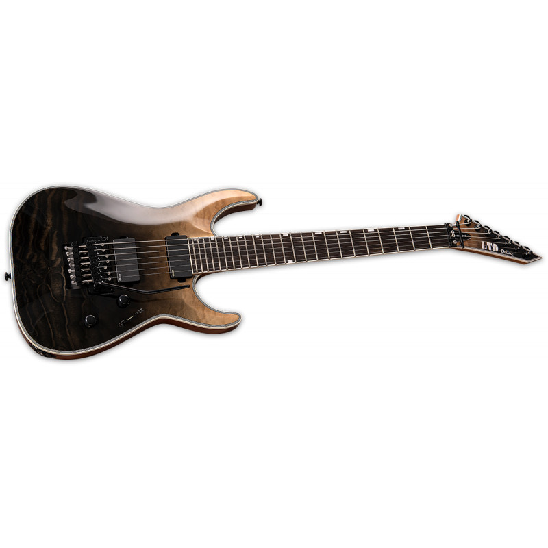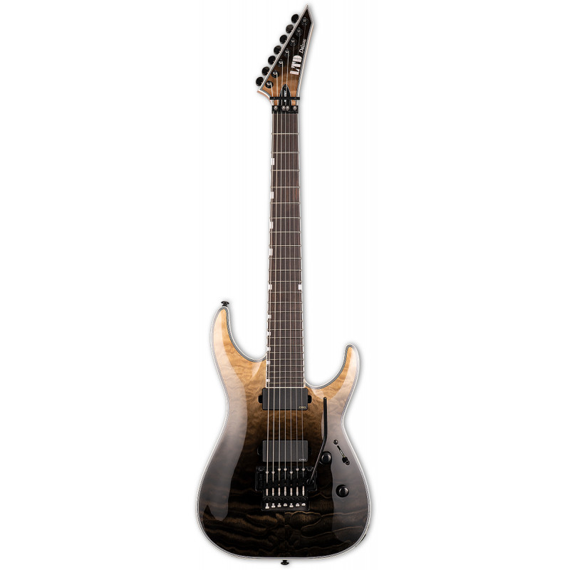 LTD MH-1007-M (Black Fade) - електрогітара, тип дизайну: глибоко вставлений гриф (встановлений через), корпус: червоне дерево з стьобаною кленовою підкладкою, мензура: 25.5", гриф: клен, 3 штуки, стерв'ятник підкладка: чорне дерево (Macassar Ebony), профіль грифу: Тонкий U, Ширина грифів: 48 мм (верхній обтислий), радіус облицювання шиї: 350 мм, інкрустований: зміщені блоки з маркерами, оксамитова: біла в тілі і шиї, міст: тремоло Floyd Rose 1000SE, детектори звуку: EMG 81-7H / EMG 85-7H, Frets: 24 XJ, Механіка: Чорний, Ставки: Grover, Управління: 1 гучність, 1 тон, 3-позиційний перемикач, колір: чорний прозорий - Див. 010/.013/.017/.026/.036/.046/.059), оздоблення: гітара, якірні та мостові ключі, виробництво: Індонезія, гарантія: 12 місяців (на електронні та механічні компоненти).