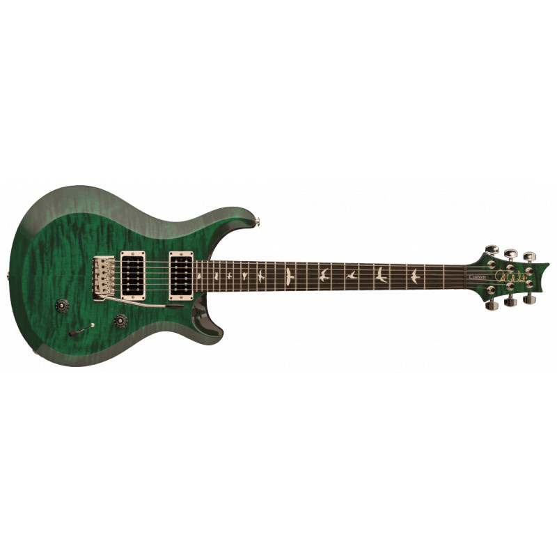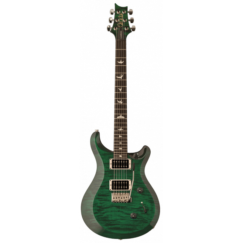 PRS S2 Custom 24 Moss Green - електрогітара, тип дизайну: вставлений гриф, корпус: червоне дерево з кучерявим верхом клена, Мензура: 25", стерв'ятник: червоне дерево, стерв'ятник підкладка: палісандр, товщина шиї: 27/32" (нульовий лад), профіль грифів: візерунок звичайний, ширина грифу: 1 21/32" (нульовий лад), 2 1/4" (на місці стерв'ятникового клею в корпусі), інкрустація: маркери ладів птахів, Міст: Тремоло PRS запатентований Тремоло, Ліпний, Саундерс: 85/15 "S" / 85/15 "S", лад: 24, Механіка: нікель, ставки: замок PRS Низька маса блокування.