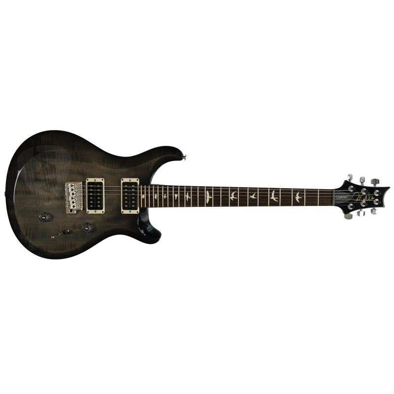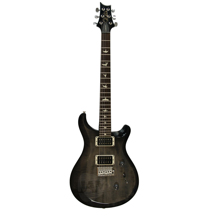 PRS S2 CUSTOM 24 (Elephant Grey) - електрогітара, вид дизайну: вставлений гриф, корпус: червоне дерево з кучерявим верхом клена, Мензура: 25", стерв'ятник: червоне дерево, стерв'ятник підкладка: палісандр, товщина шиї: 27/32" (нульовий лад), профіль грифів: візерунок звичайний, ширина грифу: 1 21/32" (нульовий лад), 2 1/4" (на місці стерв'ятникового клею в корпусі), інкрустація: маркери ладів птахів, Міст: Тремоло PRS запатентований Тремоло, Ліпний, Саундерс: 85/15 "S" / 85/15 "S", лад: 24, Механіка: нікель, ставки: замок PRS Низька маса блокування.