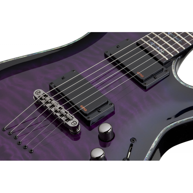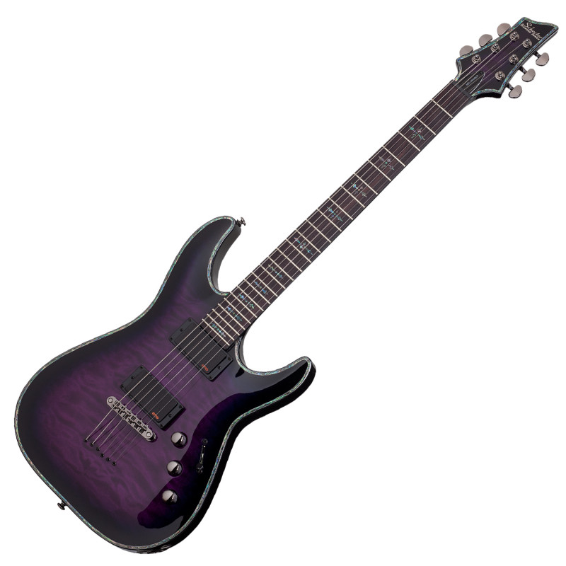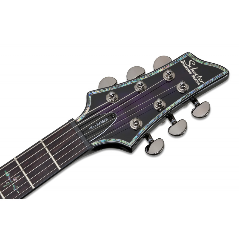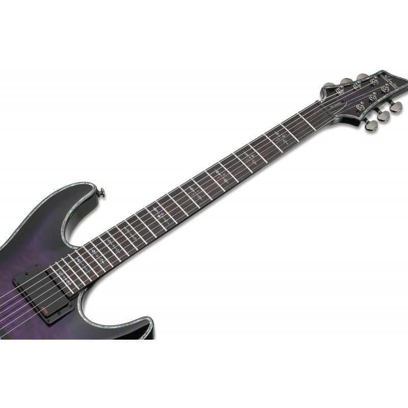 SCHECTER HELLRAISER C-1 FR TPB - електрогітара, стерв'ятниковий монтаж: Set-Neck w/Ultra Access, матеріал корпусу: червоне дерево, верхній матеріал: хвилястий клен, окантовка корпусу: Абалон з чорними/ білими / чорними багатошарами, Матеріал стерв'ятника: 3-х частинне червоне дерево, підкладка з грифом: палісандер, фрезерні позначки: Abalone Gothic Crosses, menzura: 25.5" (648 мм), лади: 24 X-Jumbo, радіус грифів: 14" (355 мм), форма грифів: Thin 'C', frets: 24 X-Jumbo, радіус грифів: 14" (355 мм), форма грифу: Тонкий 'C', Fret розміри: 1-й лад - .787" (20 мм)/ q 12th fret - .866" (22 мм), поршні: Graph Tech XL Black Tusq, ширина пори: 1.0 625" (41.3 мм), якір: подвійний, регульований, з 4мм якірним болтом, міст: Floyd Rose 1000 Series, звук мосту: EMG 81TW, звукоізоляція нед: EMG 89R, регулятори: гучність (Push-Pull)/гучність /push-pull/tone/3-пози. Перемикач, колір прилягання: чорний хром, нерівності: блокування Schecter, колір: Trans Purple Burst (TPB).