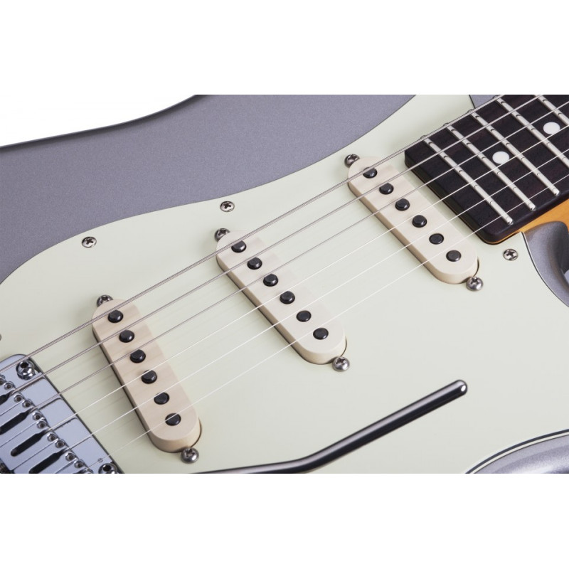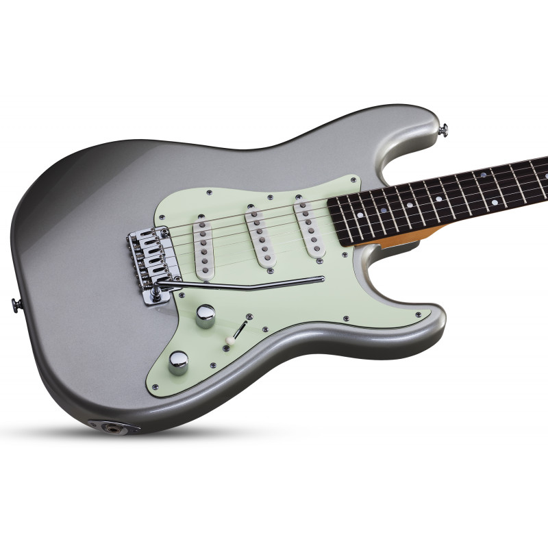 SCHECTER NICK JOHNSTON DS TRAD A.SLVR - електрогітара, насадка для грифів: болти, матеріал корпусу: вільха, стерв'ятниковий матеріал: клен, підкладка стерв'ятника: палісандер, флейта: точки, мензура: 25.5" (648 мм), лади: 22 X-Jumbo, радіус грифів: 14" (355 мм), Розміри фрета: 1-е лад - .826" (21 мм)/ 12-е лад - .866" (22 мм), верхній флогінг: Graph Tech XL Black Tusq, ширина хліба: 1.0 2653" (42 мм), якір: подвійний, регульований, з 4 мм якірним болтом, міст: Diamond Vintage Tremolo, датчики звуку: три Schecter Diamond Нік Джонстон Single Coil, контролери: об'єм / тон / 5 поз. Перемикач, колір прилягання: хром, колючий: Шектер блокування, колір: Атомне срібло (A.SLVR).
