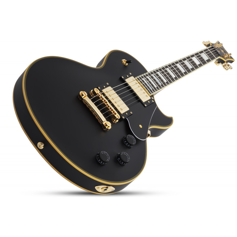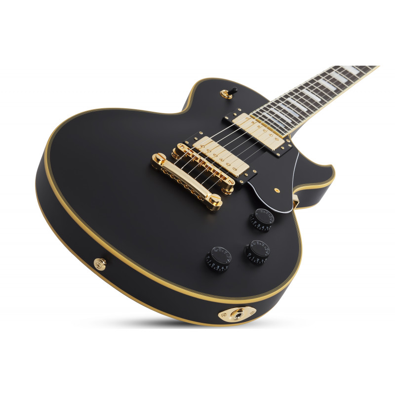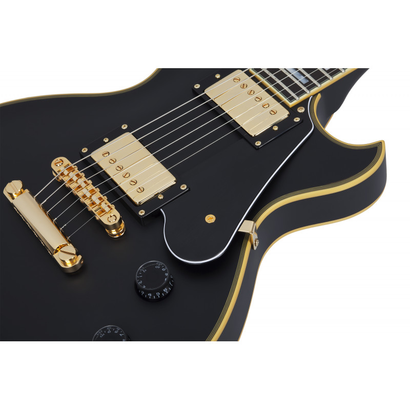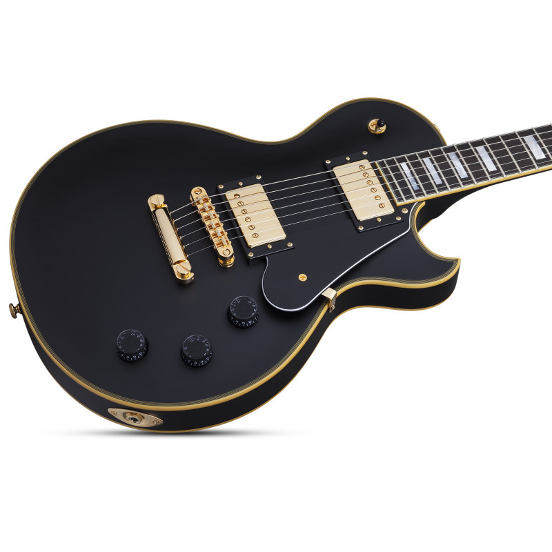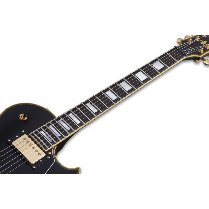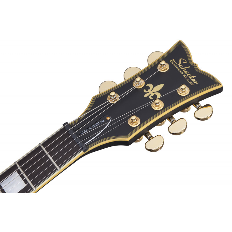 SCHECTER SOLO II CUSTOM ABSN - електрогітара, стерв'ятник кріплення: Set-Neck, матеріал корпусу: червоне дерево, верхній матеріал: твердий клен, окантовка корпусу: багатошарова Cr Aged'me, матеріал стерв'ятника: Червоне дерево з 3 штук, облицювання стерв'ятника: чорне дерево, ладні сліди: Мати перлинних блоків, мензура: 24.75" (628 мм), лад: 22 X-Jumbo, радіус грифа: 12" (305 мм) - 16" (406 мм), Розміри ладів: 1-й лад - .787" (20 мм)/ q 12-й лад - .866" (22 мм), поршні: Ernie Ball Compensated Nut, ширина хліба: 1.653" (42 мм), якір: подвійний, регульований За допомогою анкерного болта 4 мм, міст: TonePros T3BT TOM, T1' Tailpiece, Bridge Soundmaker: Schecter USA Pasadena Plus™, SoundMaker: Schecter USA Pasadena™, Регулятори: об'єм/гучність/тон (Push-Pull)/3 пози. Перемикач, колір припасування: золото, ставки: Замок Шекера, колір: Витриманий чорний атлас (ABSN)