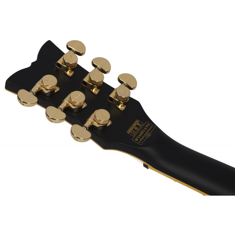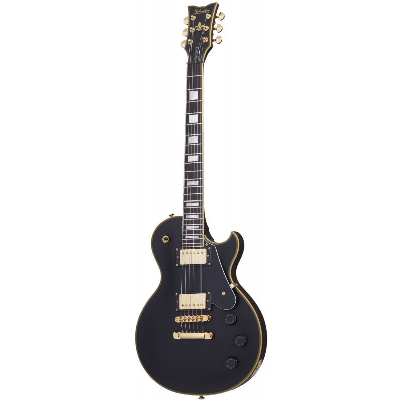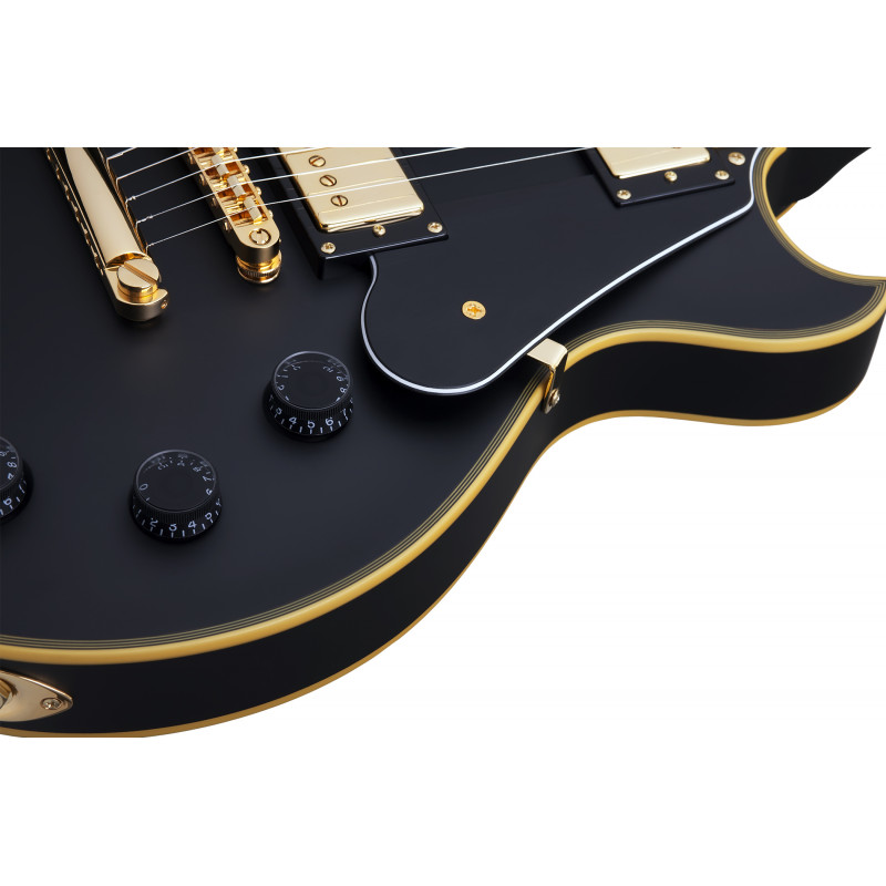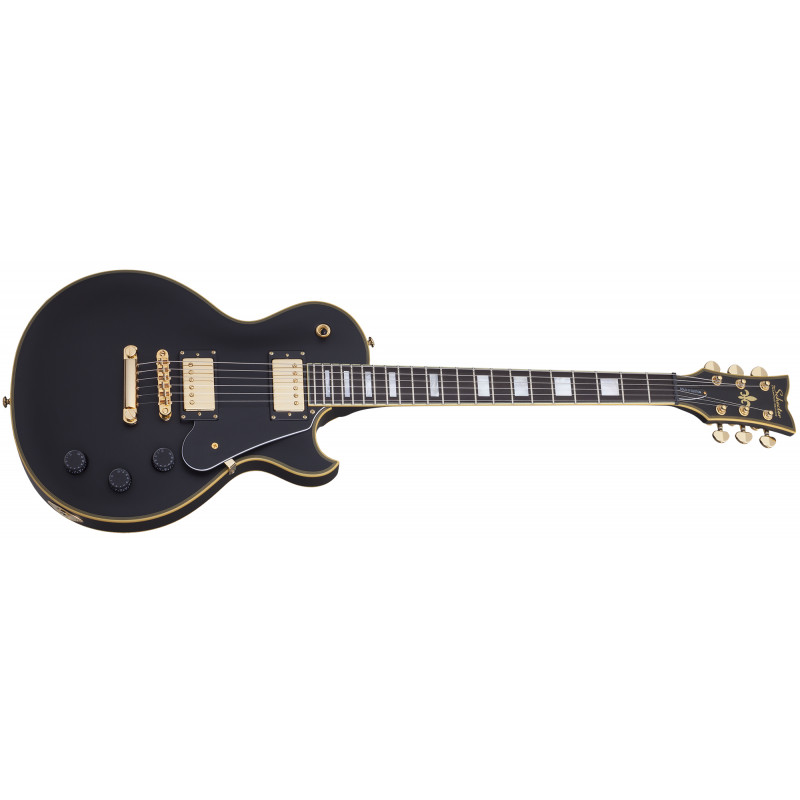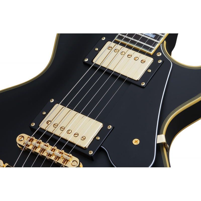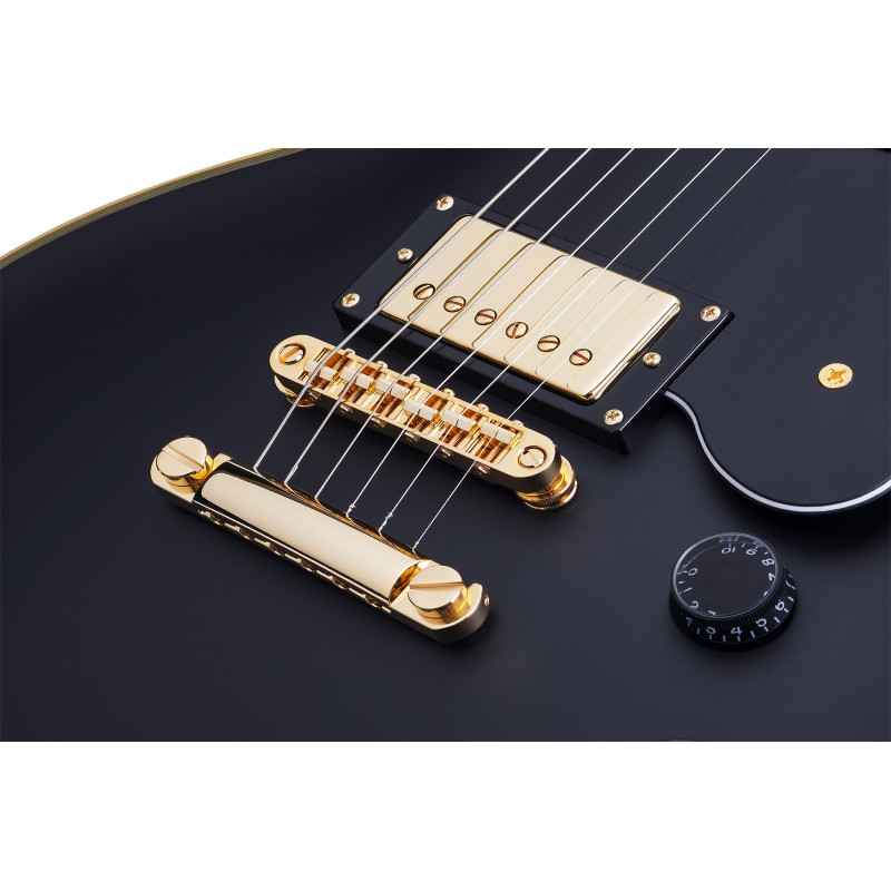 SCHECTER SOLO II CUSTOM ABSN - електрогітара, стерв'ятник кріплення: Set-Neck, матеріал корпусу: червоне дерево, верхній матеріал: твердий клен, окантовка корпусу: багатошарова Cr Aged'me, матеріал стерв'ятника: Червоне дерево з 3 штук, облицювання стерв'ятника: чорне дерево, ладні сліди: Мати перлинних блоків, мензура: 24.75" (628 мм), лад: 22 X-Jumbo, радіус грифа: 12" (305 мм) - 16" (406 мм), Розміри ладів: 1-й лад - .787" (20 мм)/ q 12-й лад - .866" (22 мм), поршні: Ernie Ball Compensated Nut, ширина хліба: 1.653" (42 мм), якір: подвійний, регульований За допомогою анкерного болта 4 мм, міст: TonePros T3BT TOM, T1' Tailpiece, Bridge Soundmaker: Schecter USA Pasadena Plus™, SoundMaker: Schecter USA Pasadena™, Регулятори: об'єм/гучність/тон (Push-Pull)/3 пози. Перемикач, колір припасування: золото, ставки: Замок Шекера, колір: Витриманий чорний атлас (ABSN)