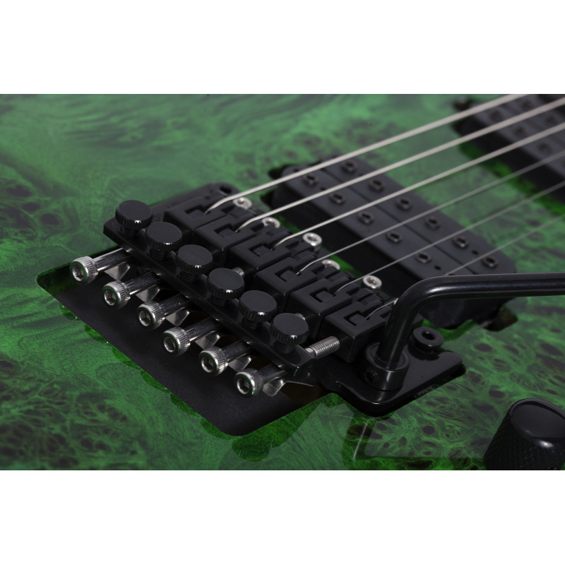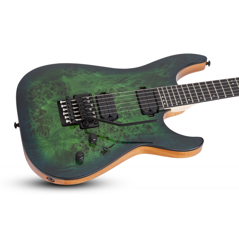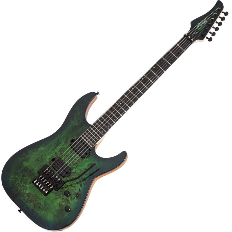 SCHECTER C-6 FR PRO A-B - електрогітара, стерв'ятник кріплення: болти, матеріал корпусу: червоне дерево, зверху: капа (бурулька), стерв'ятниковий матеріал: клен (3 грудки), укріплений прутами з вуглецевого волокна, підкладка з стерв'ятника: Wenge, мітки лади: Pearloid Offset/Reverse Dots, Menzura: 25.5" (648 мм), лади: 24 X-Jumbo, радіус грифів: 14" (355 мм), форма грифів: Тонкий C', Розміри фрета: 1-е лад - .748" (19 мм)/ q 12-е лад - .787" (20 мм), верхній флоґінг: Graph Tech XL Black Tusq, ширина пори: 1.625" (41.25" (41,2 3 мм), якір: подвійний, регульований, з 4 мм якірним болтом, міст: Floyd Rose Special 'Hot Rod' Блокування Тремоло (Schecter Exclusive), датчики звуку: 2 Schecter Diamond Decimator, контролери: об'єм (puch-pull)/тон/3 пози. Перемикач, колір фурнітури: чорний, барбуси: Шектер, колір: Aqua Burst (A'B).