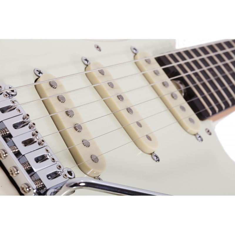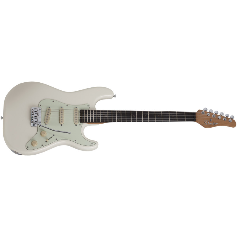 SCHECTER NICK JOHNSTON TRAD ASNW - електрогітара, насадка для грифів: болти, матеріал корпусу: вільха, стерв'ятниковий матеріал: «смажений» клен, облицювання грифом: чорне дерево, фритюрниці: латунні кола, мензура: 25,5" (648 мм), лад: 22 X-Jumbo, радіус грифів: 14" (355 мм), форма стерв'ятника: Розміри ладів: 1-й лад - .787" (20 мм)/ 12-й лад - .866" (22 мм), верхній флогінг: Graph Tech XL Black Tusq, ширина хліба: 22 мм 42 мм, якір: подвійний, регульований колесо, шия п'ята, міст: Diamond Vintage Tremolo, датчики звуку: три Schecter Diamond Нік Джонстон Single Coil, контролери: об'єм / тон / 5 поз. Перемикач, прилягаючий колір: хром, колючий: Замок Шектер, колір: Атомний сніг (ASNW).