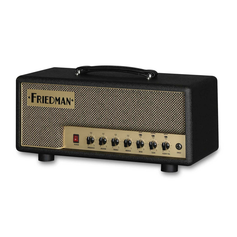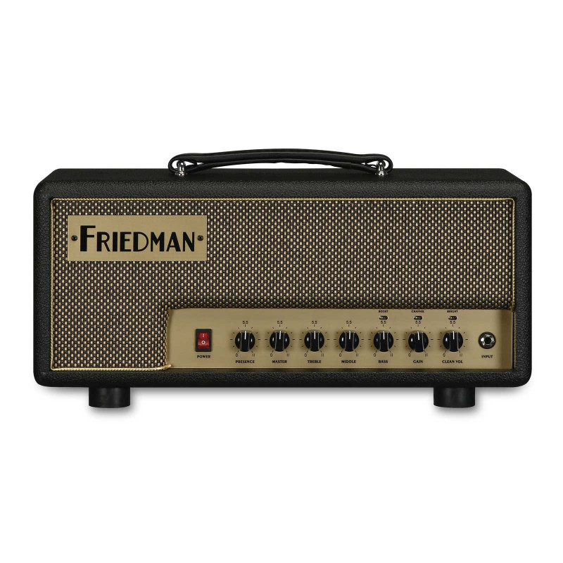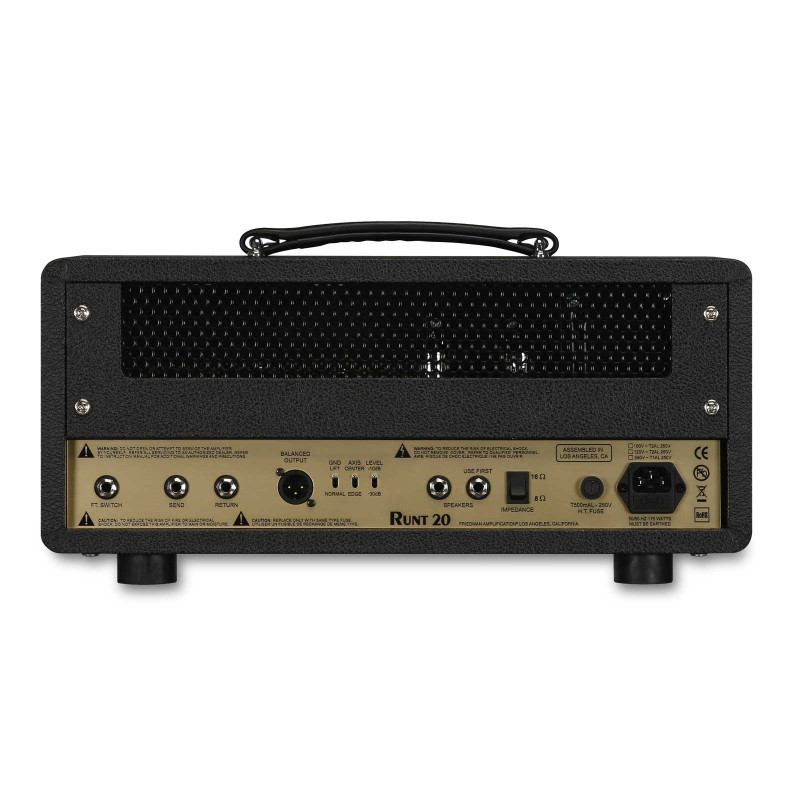 FRIEDMAN RUNT20 HEAD 230V - підсилювач гітари (голова), потужність 20 Вт, 2 канали, 2 x EL-84 в підсилювачі потужності, 3 х 12AX7 в попередньому підсилювачі, канал "Clean" з перемикачем "Volume" і "Bright", канал "Свинець" з регуляторами "Volume", "Gain", 3-смуговий еквалайзер і перемикач "Boost", вихід XLR з емуляцією шафи, перемикачі "Ground Lift", "Вісь" і "Рівень", буферизовані послідовною петлею ефектів, 8 і 16 Ом , футчвіч (одно кнопка)