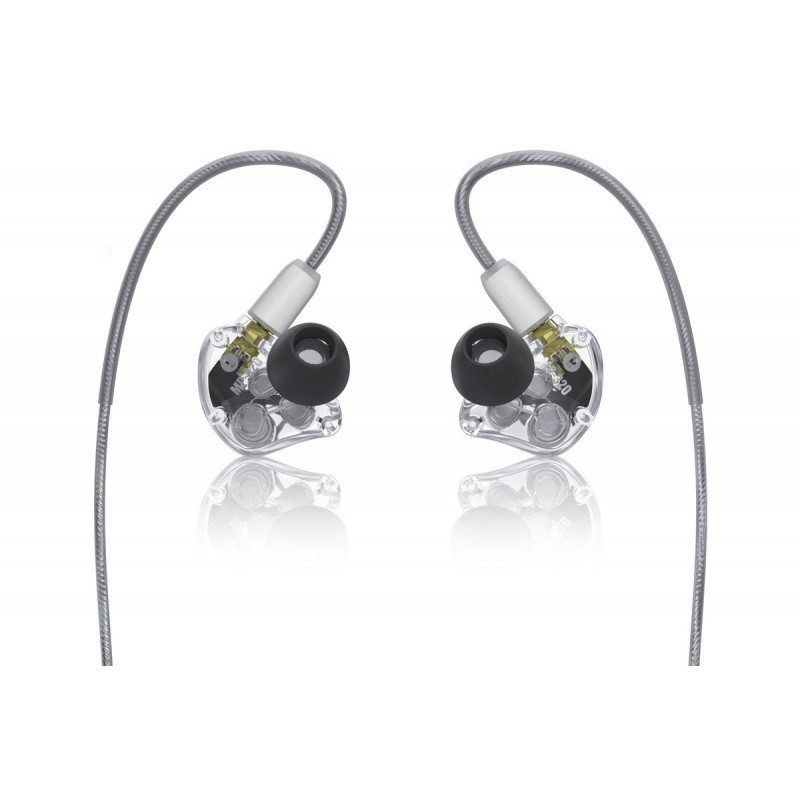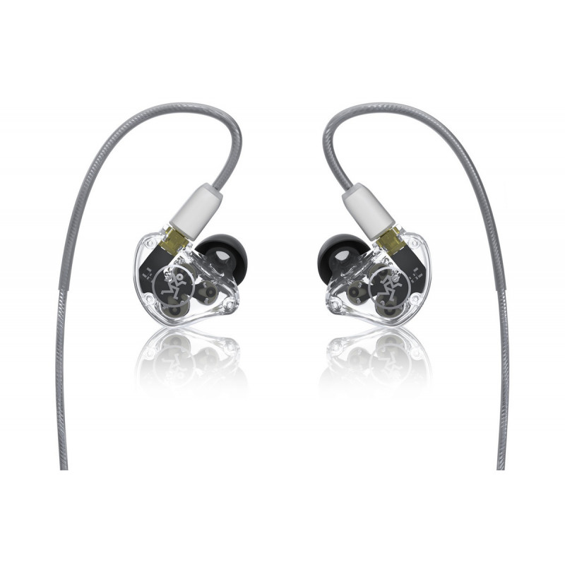 MACKIE MP-320 - професійні вушні монітори, потрійний динамічний драйвер, частотний діапазон 20 Гц - 20 000 Гц, чутливість 93 дБ, опір 32 Ом, три типи насадок трьох розмірів, пластиковий корпус повний, кросовер три смуги, прозорий кузов, очисні аксесуари, кабель MMCX.