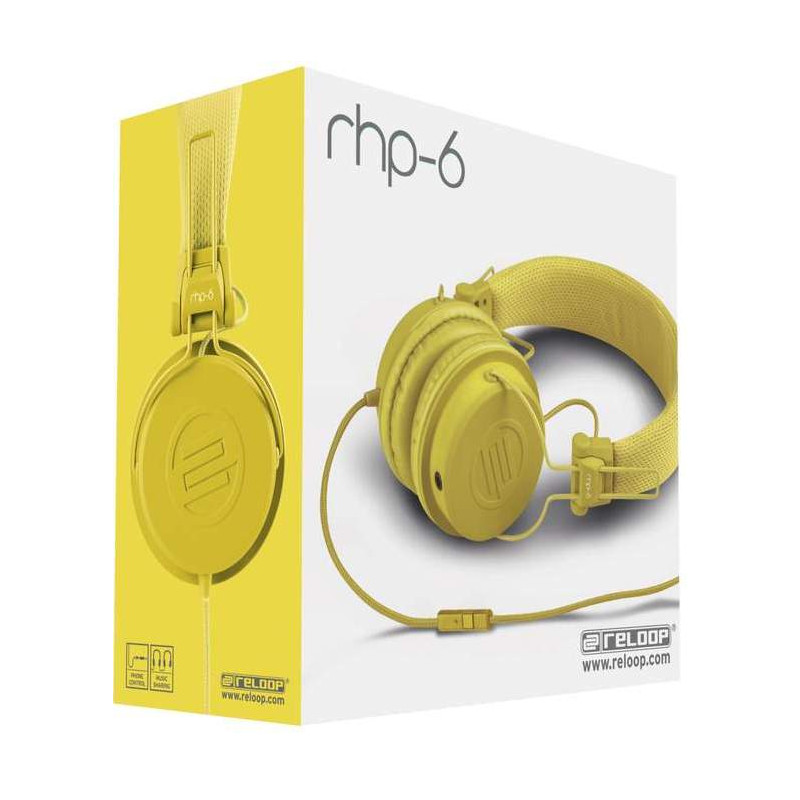 RELOOP RHP-6 YELLOW - закриті навушники, діапазон частот: 10 Гц - 20 кГц, максимальний вхід: 100 мВт, опір: 32 Ом q/- 15% (1 кГц, 1 мВт), випромінювач: 38 мм, акустичний тиск: 95 дБ q/- 3 дБ (при 1 мВт), потужність динаміка: 1 мВт, Підключення: позолочений роз'єм 3,5 мм, мікрофон: всенаправлений, частотний діапазон: 50 Гц - 16 кГц, опір: 8,2 кМ, чутливість: -62 дБ /- 3 дБ (q 1 кГц), співвідношення сигнал / шум: -58 дБ, вага: 123 г.