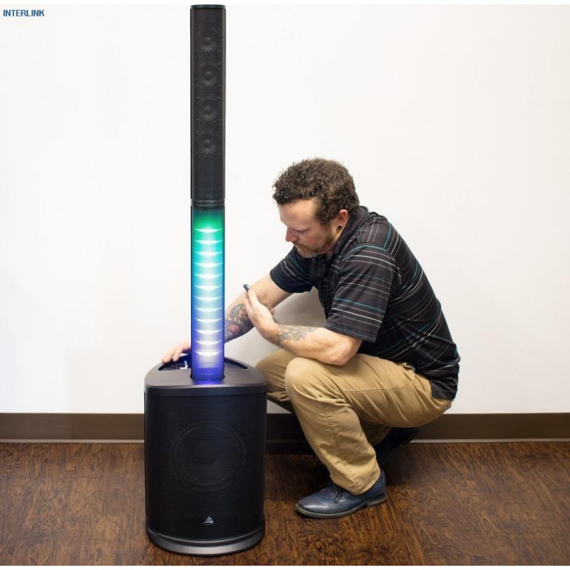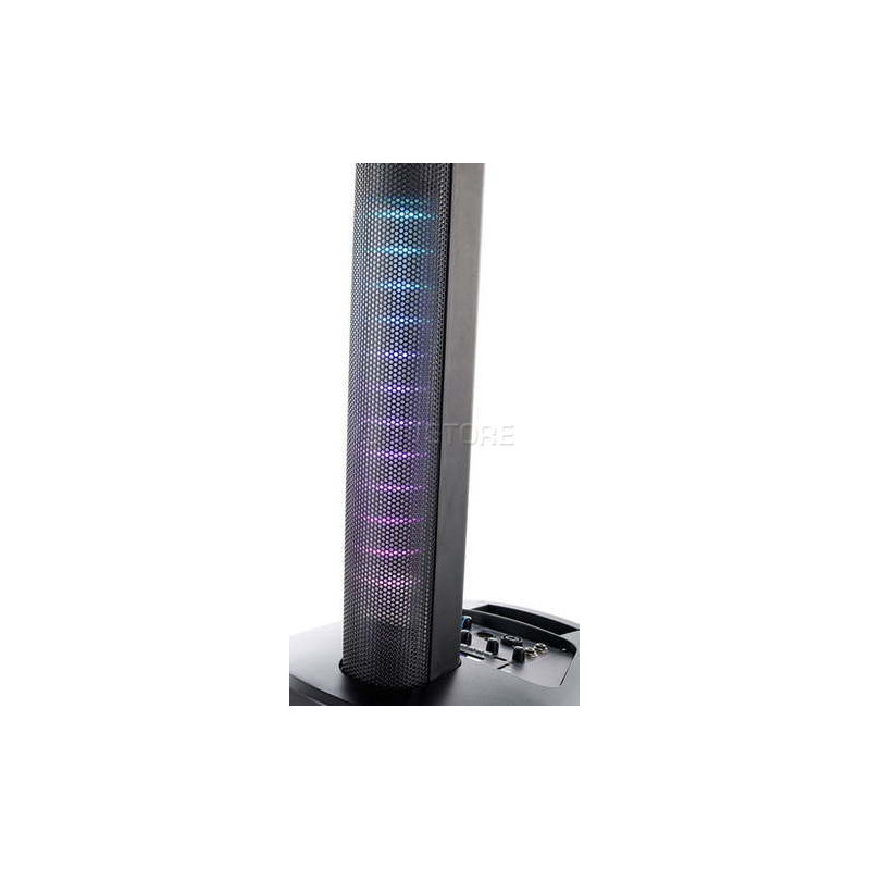 Потужність акустичної системи становить 200 Вт, що дає вбудований підсилювач D-класу. Також є модуль Bluetooth для відтворення музики з мобільних пристроїв, вбудований MP3-плеєр. Файли можуть бути включені через USB-накопичувачі та карти SD / MMC. Система має вбудований змішувач з трьома каналами і еквалайзером, світлодіодним освітленням, що створює атмосферу свята. Дистанційне керування музикою. Комплект включає акустичні кабелі та стелажі. Розмір звукового підсилювача в зібраному стані - 415 х 325 х 1380 мм, вага - 13,3 кг.