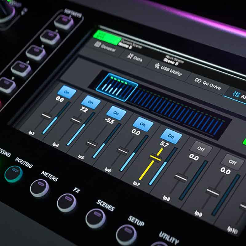 Підтримка додатків Qu-MixPad і Qu-You для iOS, Android, Windows та macOS забезпечує повний віддалений контроль. Конфігуровані SoftKeys, сенсорний екран і керування фейдерами роблять управління мікшером швидким і зручним у будь-якому середовищі.