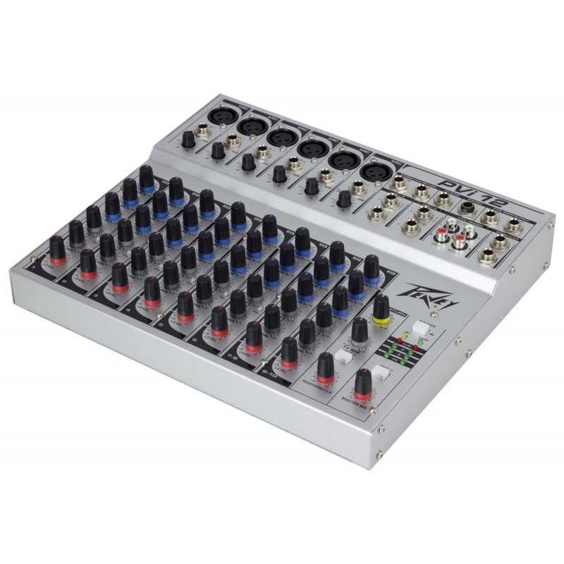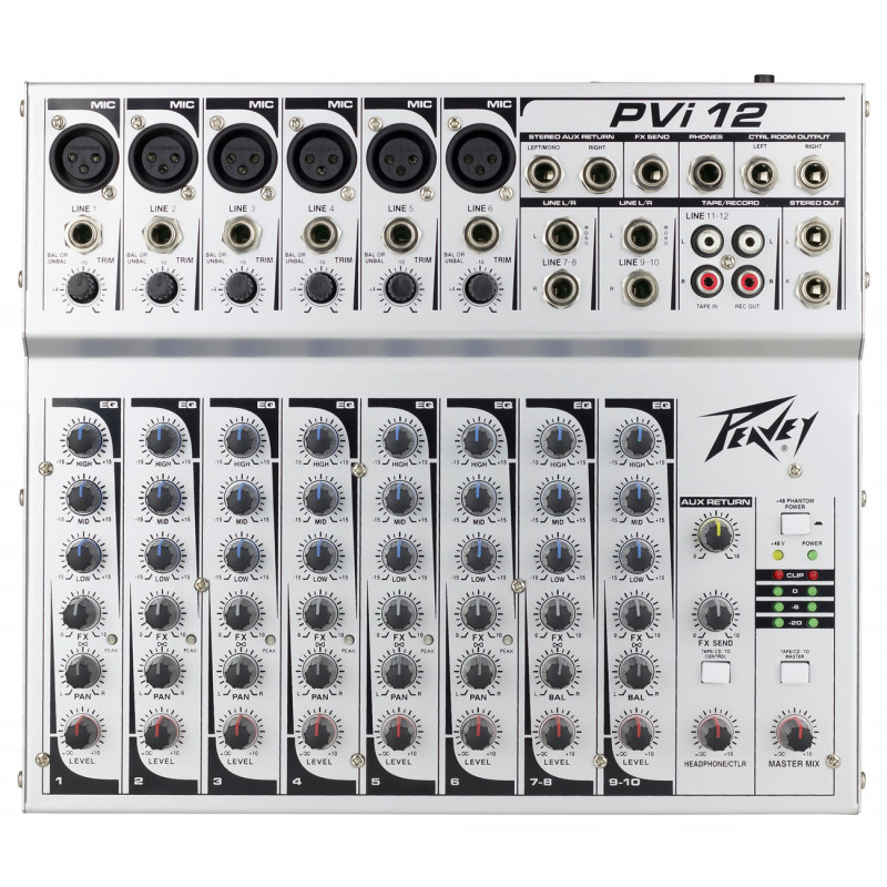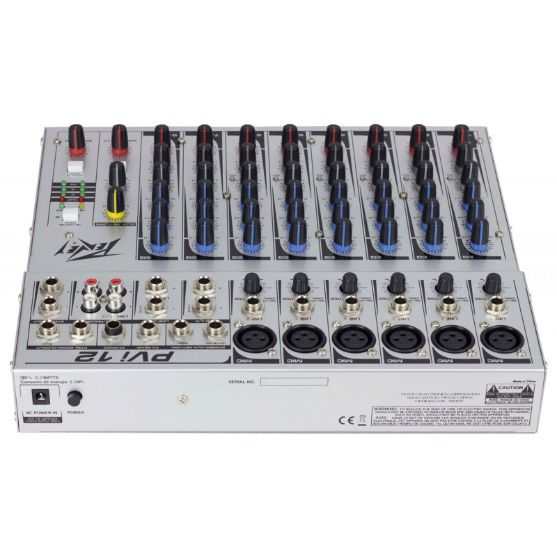 PEAVEY PVi12 - змішувальна консоль, аналогові входи: 6 моно (роз'єм XLR / 1/4"), 2 стерео запис (роз'єм 2 x 1/4"), Aux Return (роз'єм 2 x 1/4"), Tape In (2 x RCA), аналогові виходи: Stereo Out (роз'єм TRS 2 x 1/4"), вихід для навушників (роз'єм 1/4"), контрольна кімната (2 х 1/4" роз'єму TRS), Aux Send (1/4" Роз'єм), Rec Out (2 x RCA), еквалайзер: 3-смуговий на кожному каналі, діапазон частот: 20 Гц - 20 кГц, Розміри: 64 х 295 х 260 мм, Вага: 1.63 кг, Потужність фантома: 12 місяців, виробництво: Китай.