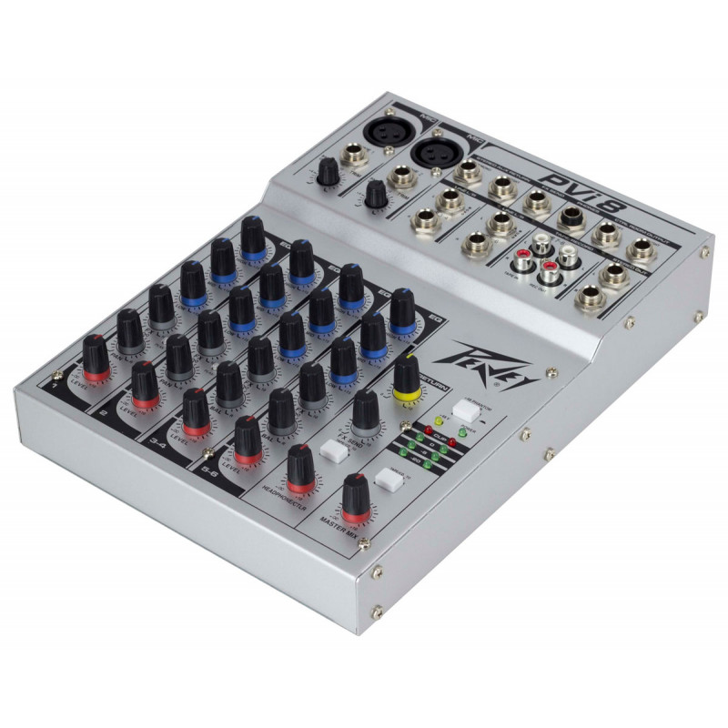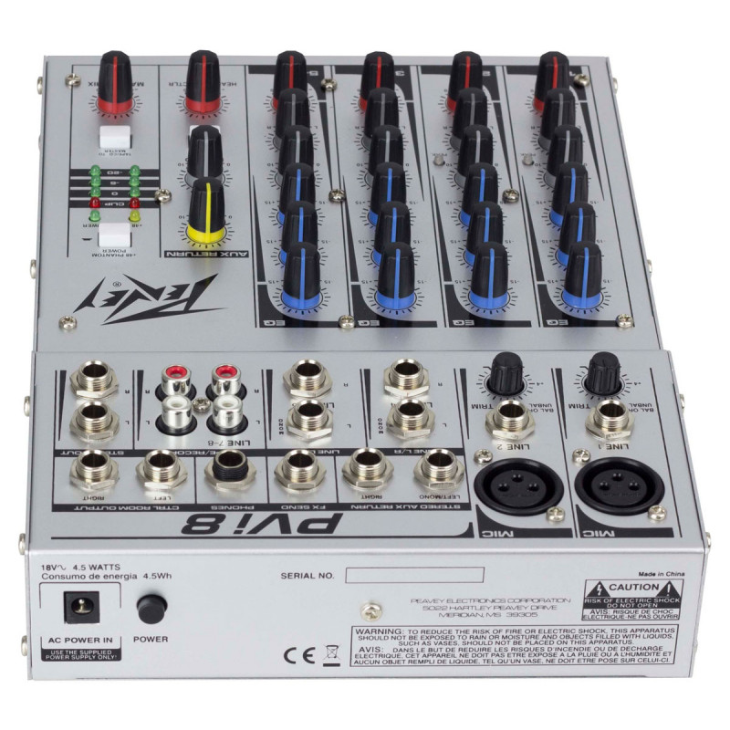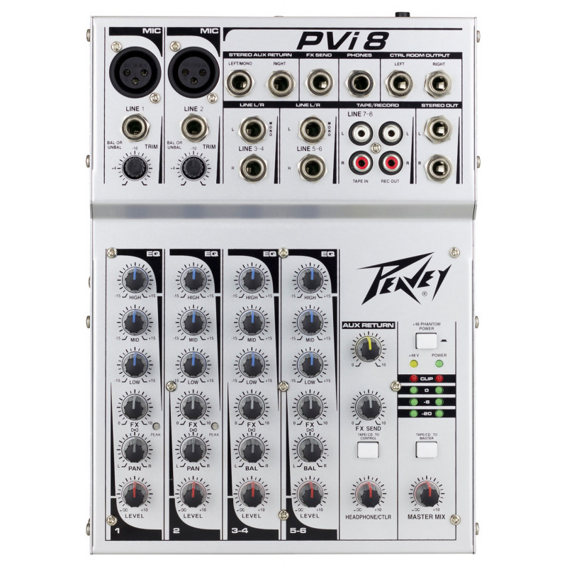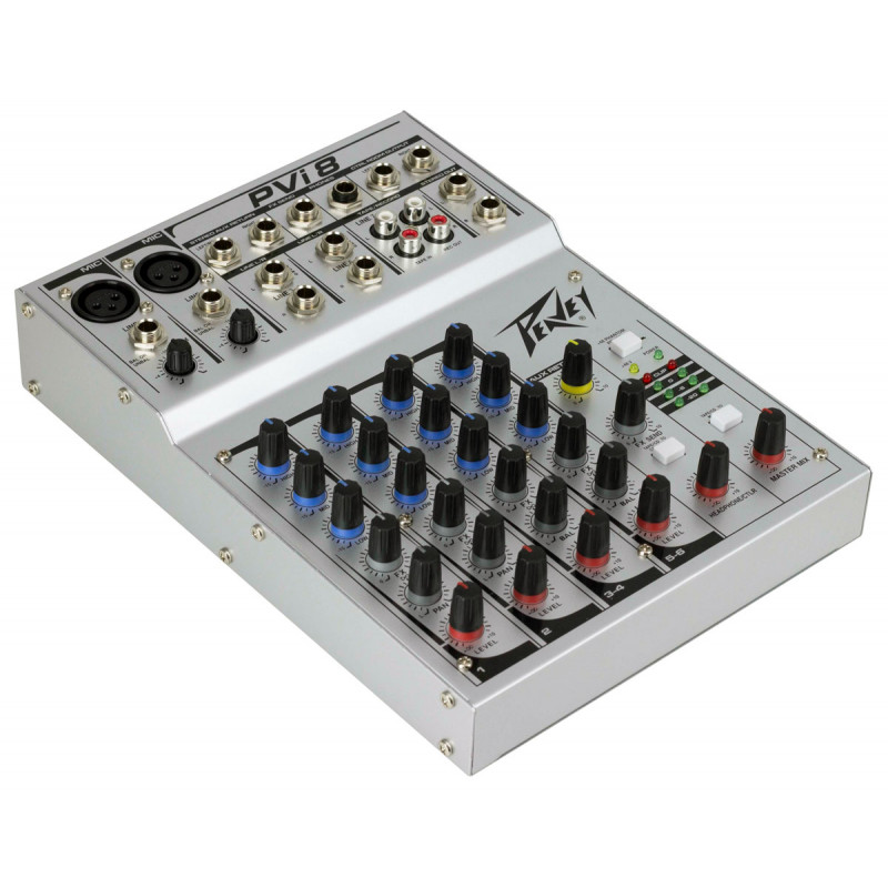 PEAVEY PVi8 - змішувальна консоль, аналогові входи: 2 моно (роз'єм XLR / 1/4"), 2 стерео входи (роз'єм 2 x 1/4"), Aux Return (роз'єм 2 x 1/4"), Tape In (2 x RCA), аналогові виходи: Stereo Out (роз'єм TRS 2 x 1/4"), вихід із навушників (роз'єм 1/4"), контрольна кімната (2 x 1/4" роз'єму TRS), Aux Send (1/4" Роз'єм), Rec Out (2 x RCA), еквалайзер: 3-смуговий на кожному каналі, діапазон частот: 20 Гц - 20 кГц, Розміри: 64 х 187 х 260 мм, вага: 1,36 кг, Потужність фантома: 12 місяців, виробництво: Китай.