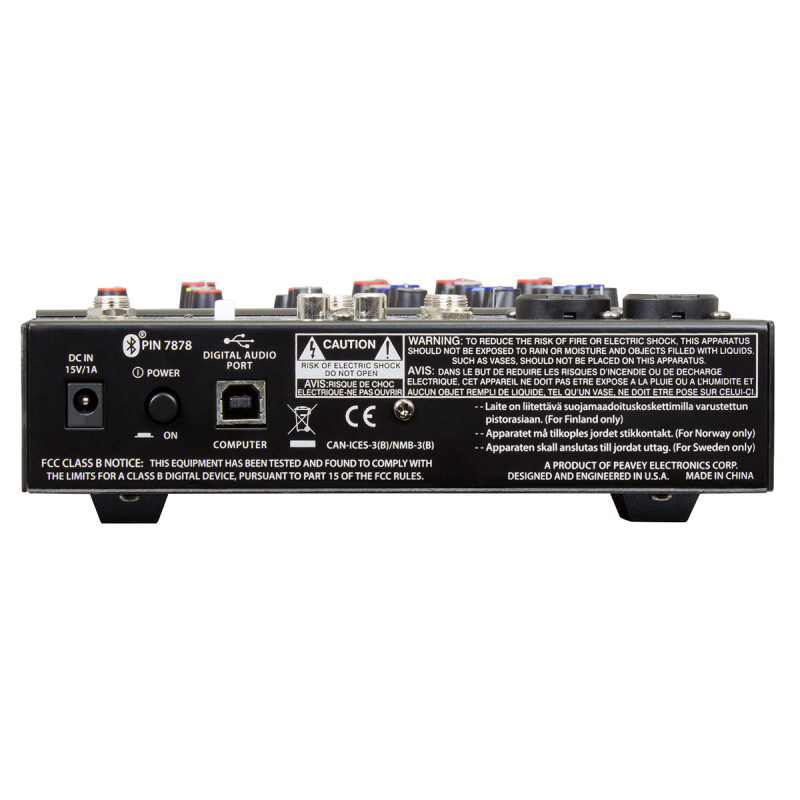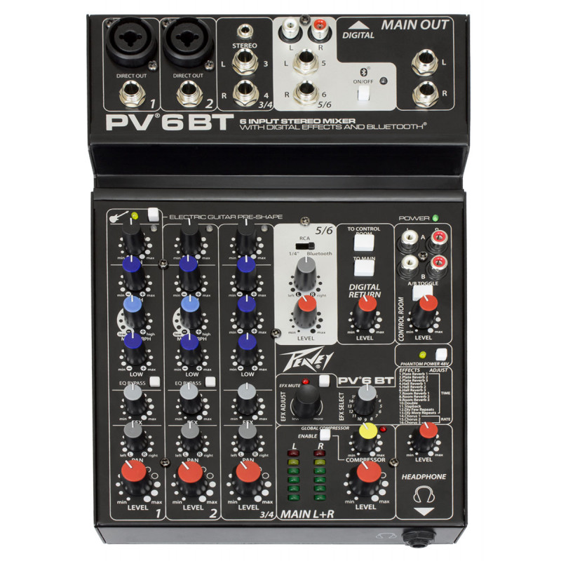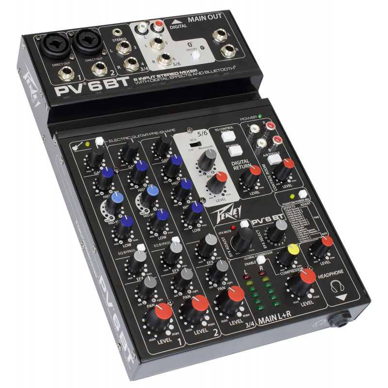 PEAVEY PV6 BT - микшерный пульт, аналоговые входы: 2 моно (XLR / 1/4" джек combo), 1 стерео вход (2 х 1/4" Jack + 3,5мм миниджек) 1 медиавход (2 х 1/4" Jack + 2 х RCA), аналоговые выходы: Main Out (2 x 1/4" TRS Jack), Выход для наушников (1/4" Jack), 2 х Control Room выхода (RCA x 2), Direct Out (каналы 1-2), эквалайзер: 3-полосный на каждом канале, эффекты: DSP процессор (16 программ), цифровые выходы: USB Audio Class 2.0 compliant, частотный диапазон: 10 Гц - 20 кГц, цифровые входы: USB Audio Class 2.0 compliant, Bluetooth 3.0, размеры: 184 x 290 x 56 мм, вес: 1,84 кг, фантомное питание +48В, встроенный мастер-компрессор, USB аудиоинтерфейс 16бит/48кГц (2 входа/2выхода), гарантия: 12 месяцев.