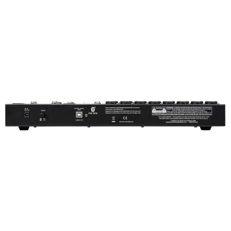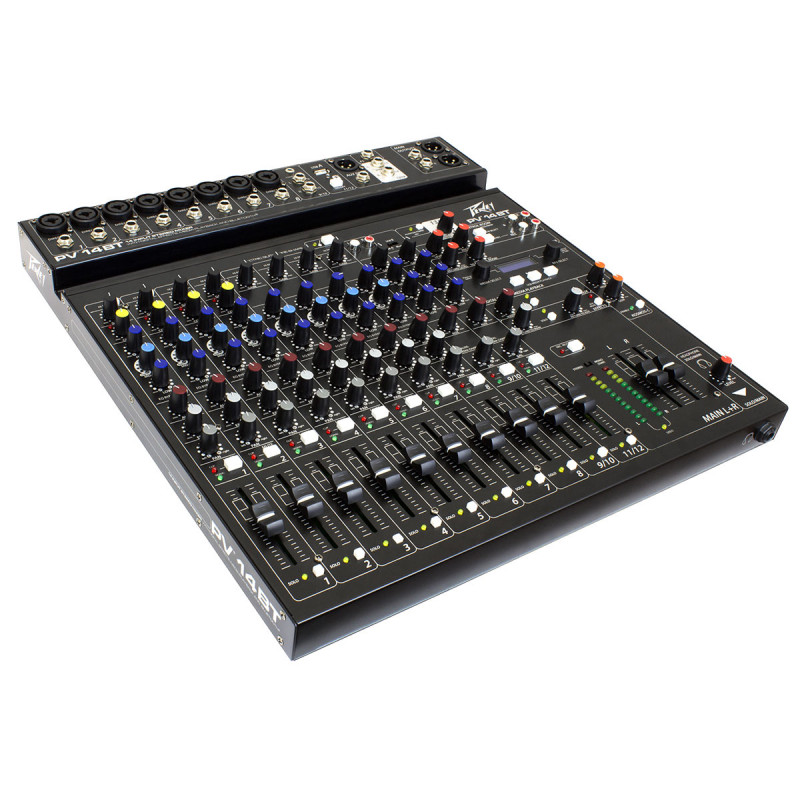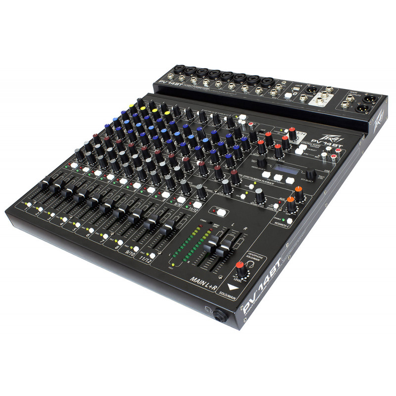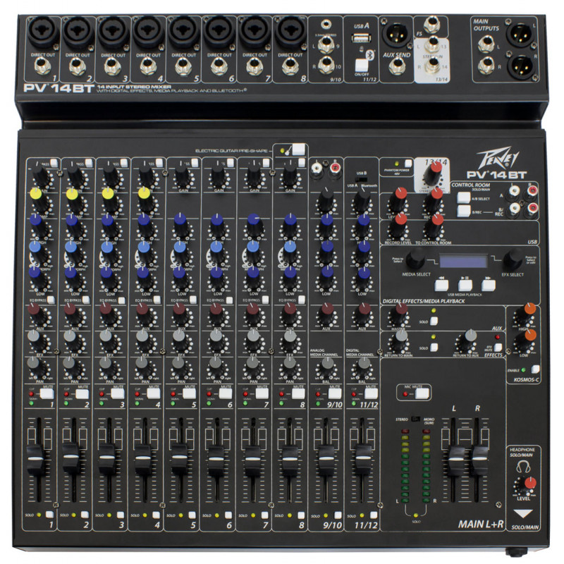 PEAVEY PV14 BT - змішувальна консоль, аналогові входи: 8 моно (комбо роз'єму XLR / 1/4"), 1 вхід стерео (1/4" Роз'єм q 3,5 мм мініджек, 2 x RCA), 1 стерео вхід (1/4 роз'єму) аналогових виходів: 2 виходи main Out (2 x XLR q 2 x 1/4" роз'єму TRS), вихід із навушників (роз'єм 1/4),2 x вихід з кімнати керування (RCA x 2), Aux Send (1/4" Роз'єм q XLR), Прямий вихід (канали 1-8), еквівалент: 3-діапазон на кожному каналі, Ефекти: процесор DSP, цифрові розетки: USB Аудіо клас 2.0 сумісний, Частотний діапазон: 14 Гц - 25 кГц, цифрові входи: USB Audio Клас 2.0 сумісний, USB A (для підключення накопичувача), Bluetooth 3.0.