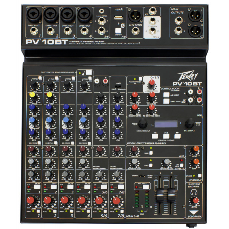 PV 10 BT - це дійсно функціональна консоль змішування, яка може бути серцем вашої продуктивності. Судіть самі: 4 мікрофона preampa, чотири прямих виходи для запису каналів, два стерео канали, виділений медіа-канал з бездротовим протоколом Bluetooth®, якісна цифрова обробка, LCD дисплей, можливість передачі аудіо через USB і файли playBACK MP3 з флешки, ексклюзивна технологія поліпшення звучання Peavey Kosmos®, два перемиканих виходи монітора, 2 канали з вбудованим компресором і один канал з налаштовуваною гітарною преампою - це далеко не повний список функцій Цей неймовірно універсальний мікшер ідеально підходить як для домашньої студії, так і для сценічних виступів.