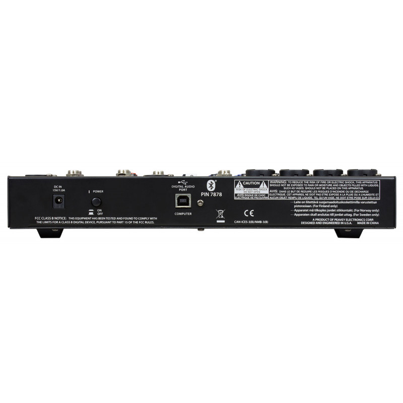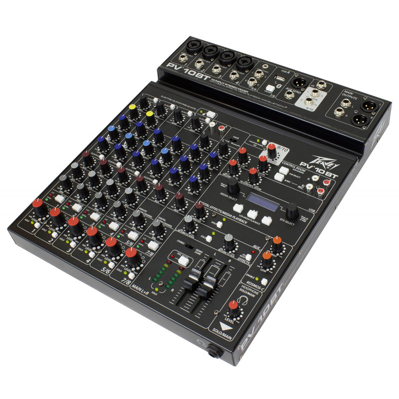 PEAVEY PV10 BT - змішувальна консоль, аналогові входи: 4 моно (комбо роз'єму XLR / 1/4"), 2 х вхід в стерео (1/4" Джек q 3,5 мм мініджек, 2 x RCA), аналогові виходи: 2 виходи Main Out (2 x XLR 2 x 1/4" роз'єм TRS), вихід навушників (1/4" Роз'єм), 2 х вихід в кімнаті управління (RCA x 2), Aux Send (1/4" Джек q XLR), Direct Out (канали 1-4), еквалайзер: 3-смуговий на кожному каналі, Ефекти: процесор DSP, Цифрові розетки: USB Audio клас 2.0 сумісний, частотний діапазон: 14 Гц - 25 кГц.