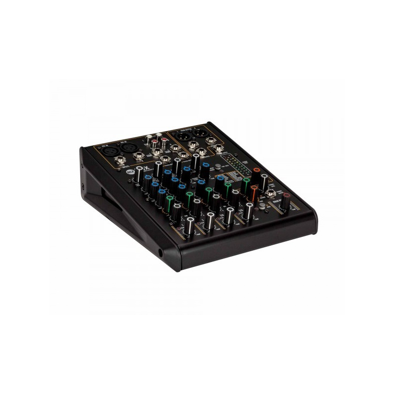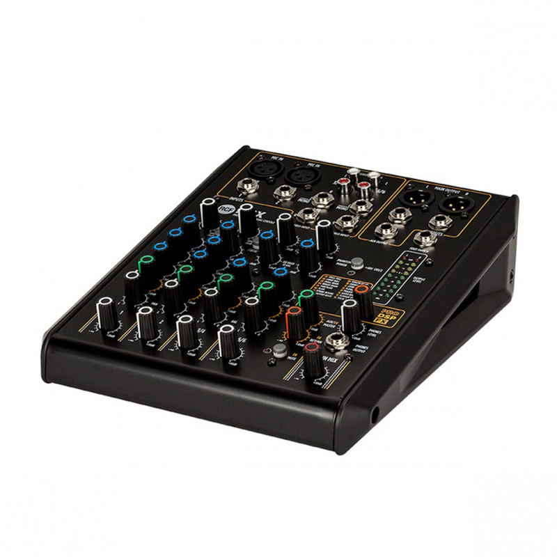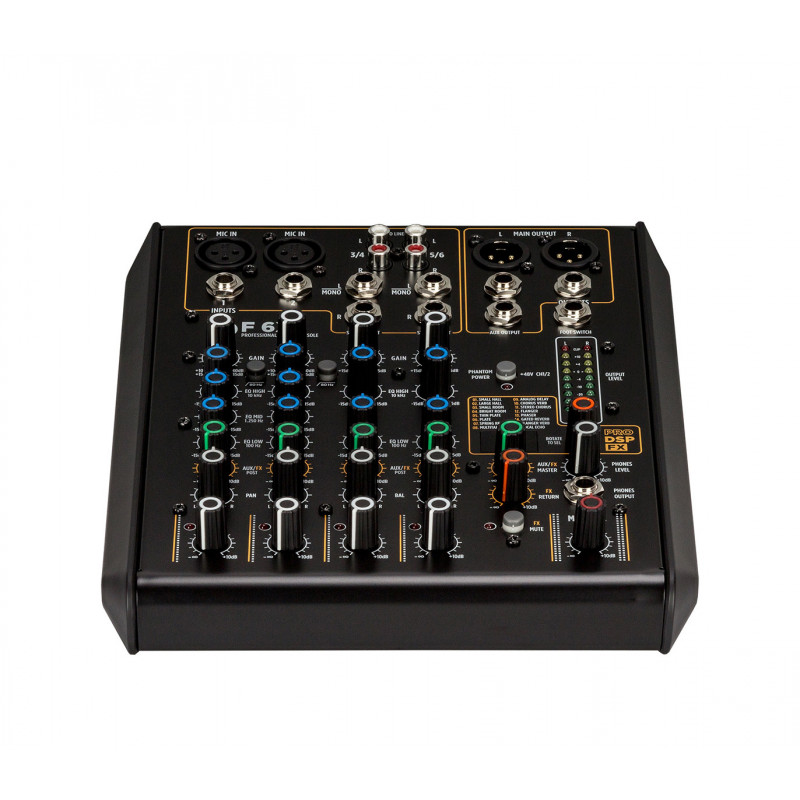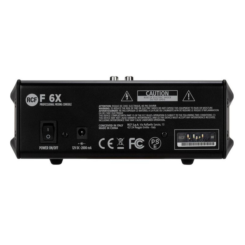 RCF F-6X - змішувальна консоль, 2 мікрофона / лінійний вхід, 2 лінійних стерео вхід, один aux / FX (пост), збалансований шлях основного аудіо виходу з входу до виходу, PRO DSP FX на борту з 16 попередньо встановленими, міцне металеве шасі, зовнішнє універсальне джерело живлення, металева конструкція корпусу, розміри: 255 х 79 х 210 мм, вага: 1,8 кг