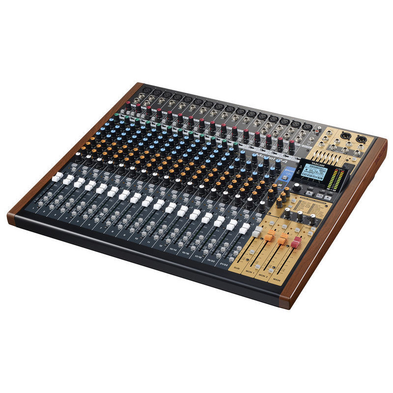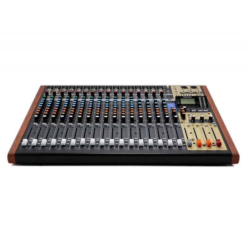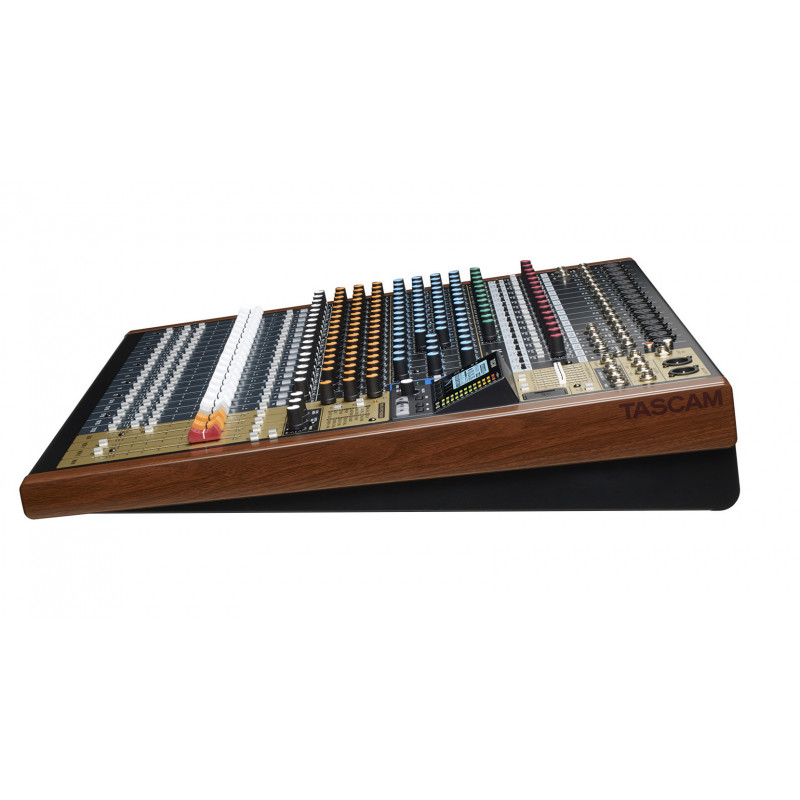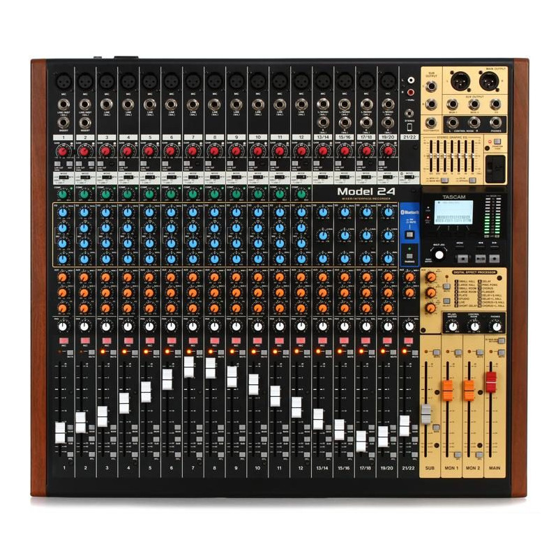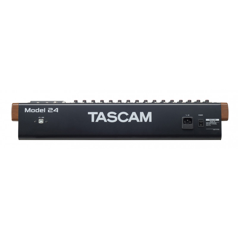 Змішувач TASCAM MODEL 24 має діапазон частот 20 Гц - 30 кГц і підтримує 24 біти / 48 кГц. Змішувач має 100 мм фізичних фадерів, 16 мікрофонних входів XLR і 16 високотехнологічних пре-провайдерів, 22 лінійних входи, 6 лінійних виходів, роз'єми RCA, вихід навушників і безліч регуляторів. Існує також невеликий дисплей для управління і управління налаштуваннями пристрою.