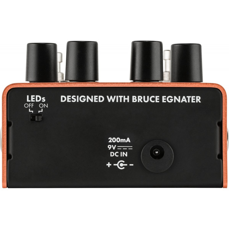 PEDAL MTG TUBE TREMOLO має повністю оригінальну схему Fender. Корпус виготовлений з легкого і міцного анодованого алюмінію, а світлодіодний індикатор надає вашому педалі безпомилковий вигляд Fender. Вимкнені світлодіодні ліхтарі регуляторів гарантують налаштування на темній стадії.